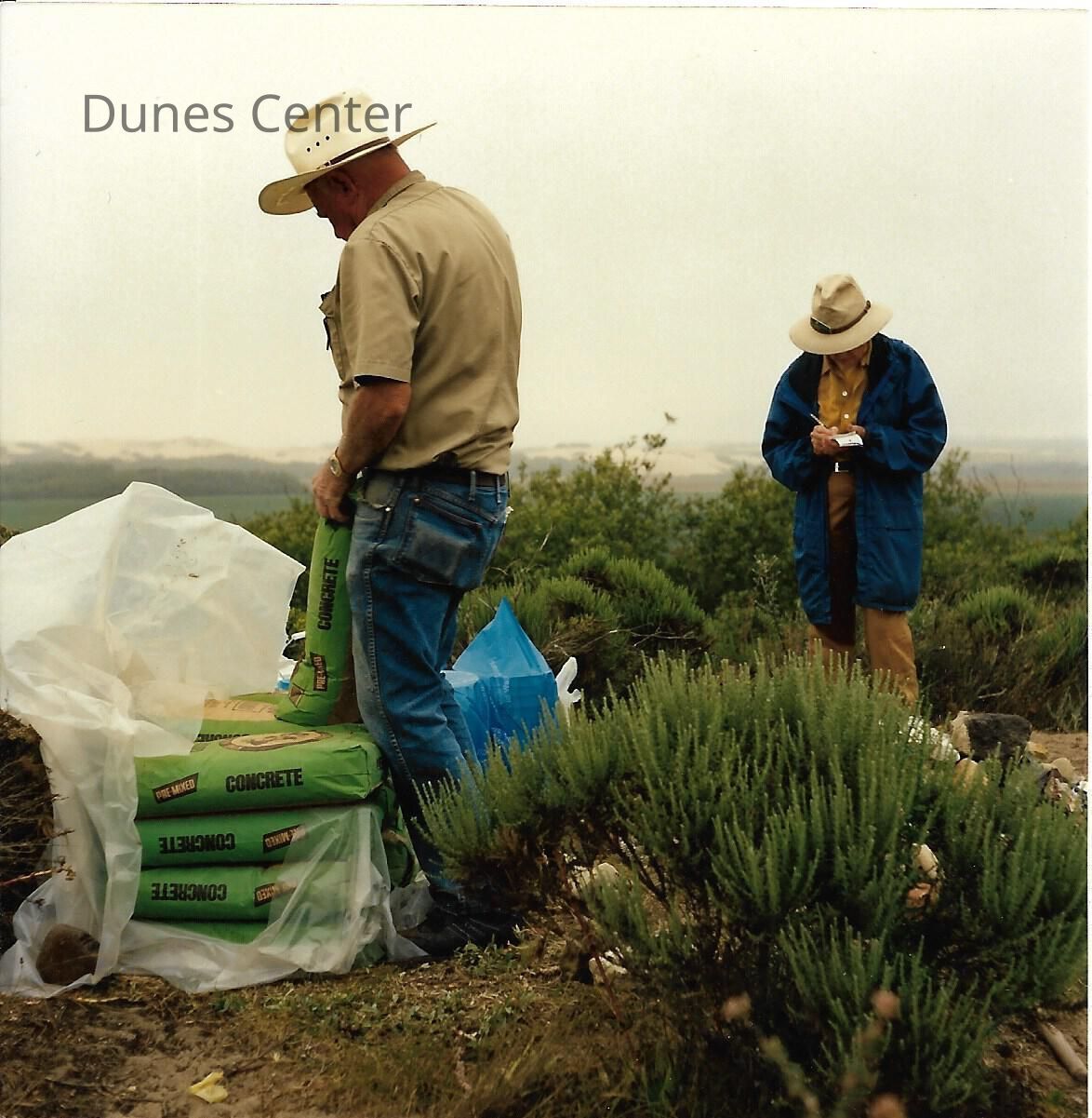 Pictures of the construction sequence of the monumnet on Coreopsis Hill for Joseph Enos and Mary Barcellos Enos for allowing people to lead hikers on their propertyto see the beautiful dune flowers, monument idea by Kathleen Goddard Jones, designed and constructed by Jack Beigle, Al Spierling, Norm Hammond, and Hal Shartz with Kathleen Goddard Jones supervising, 1994 - 4" x 4" color photographEntry/Object ID