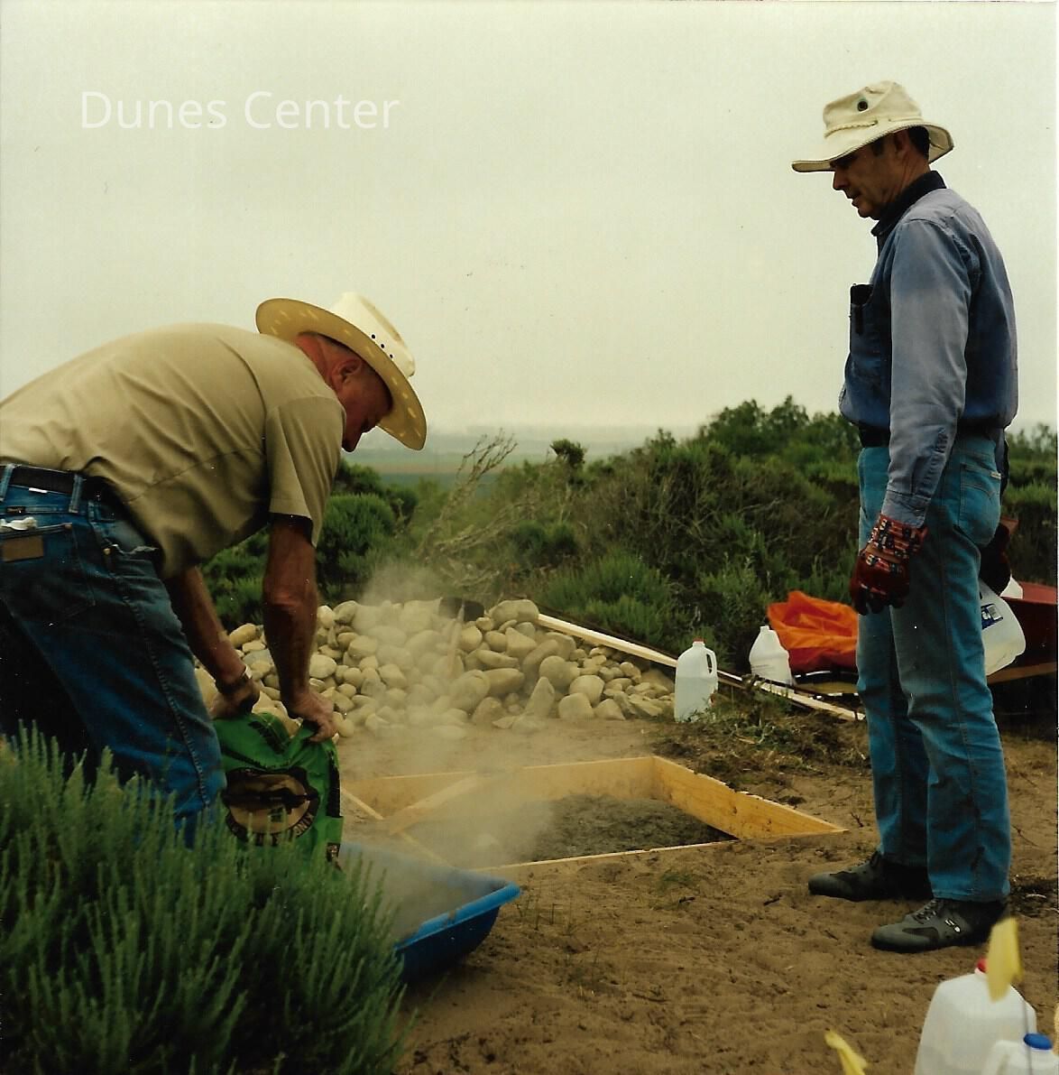 Pictures of the construction sequence of the monumnet on Coreopsis Hill for Joseph Enos and Mary Barcellos Enos for allowing people to lead hikers on their propertyto see the beautiful dune flowers, monument idea by Kathleen Goddard Jones, designed and constructed by Jack Beigle, Al Spierling, Norm Hammond, and Hal Shartz with Kathleen Goddard Jones supervising, 1994 - 4" x 4" color photographEntry/Object ID