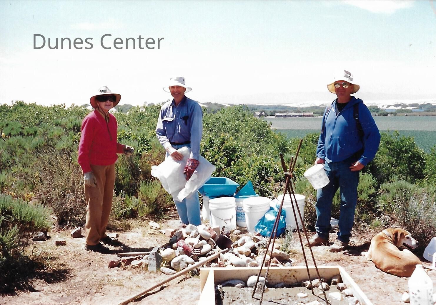 Pictures of the construction sequence of the monumnet on Coreopsis Hill for Joseph Enos and Mary Barcellos Enos for allowing people to lead hikers on their propertyto see the beautiful dune flowers, monument idea by Kathleen Goddard Jones, designed and constructed by Jack Beigle, Al Spierling, Norm Hammond, and Hal Shartz with Kathleen Goddard Jones supervising, 1994, 3.5" x 5" color photograph