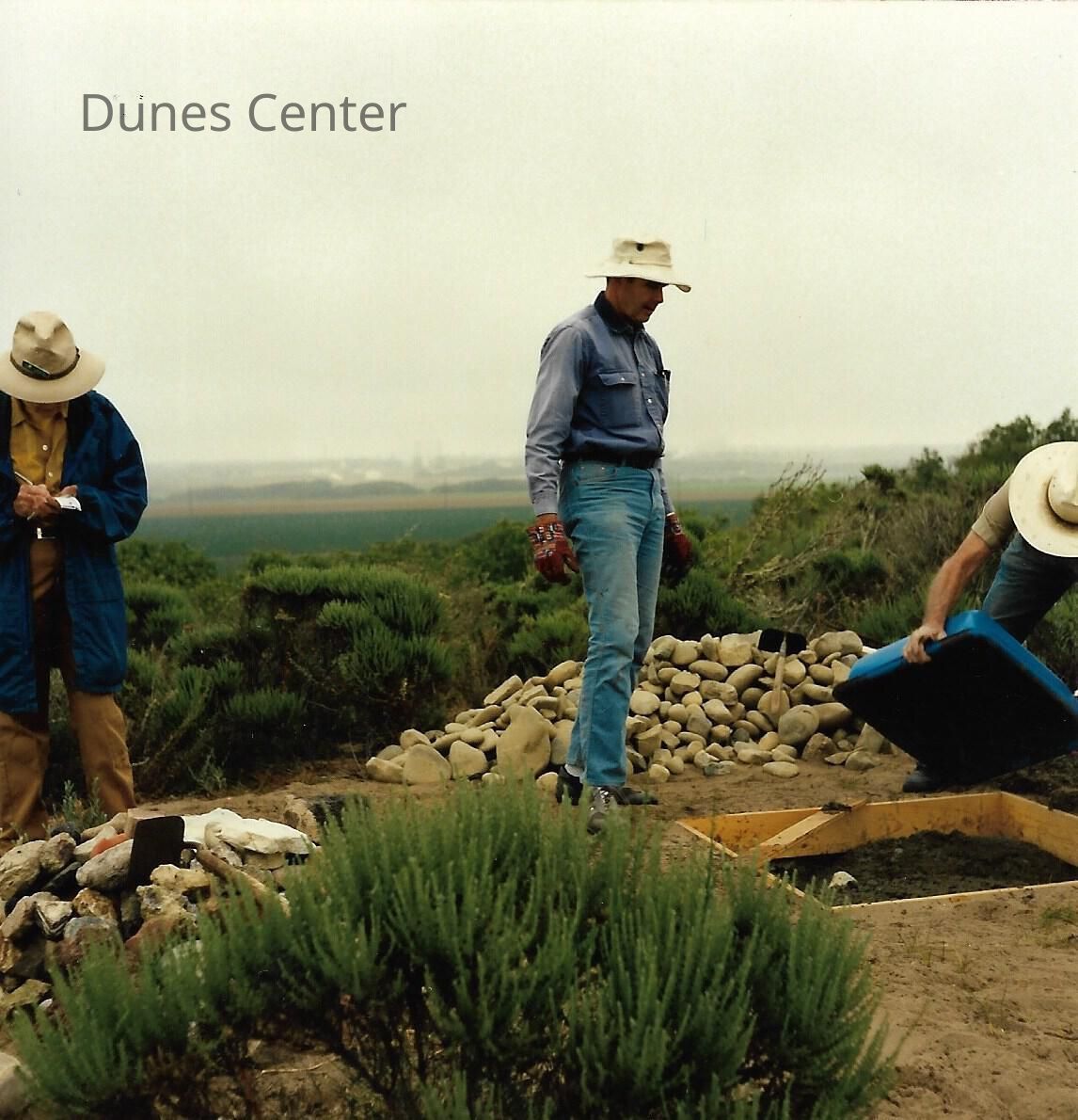 Pictures of the construction sequence of the monument on Coreopsis Hill for Joseph Enos and Mary Barcellos Enos for allowing people to lead hikers on their property to see the beautiful dune flowers, monument idea by Kathleen Goddard Jones, designed and constructed by Jack Beigle, Al Spierling, Norm Hammond, and Hal Shartz with Kathleen Goddard Jones supervising, 1994 - 4" x 4" color photographEntry/Object ID