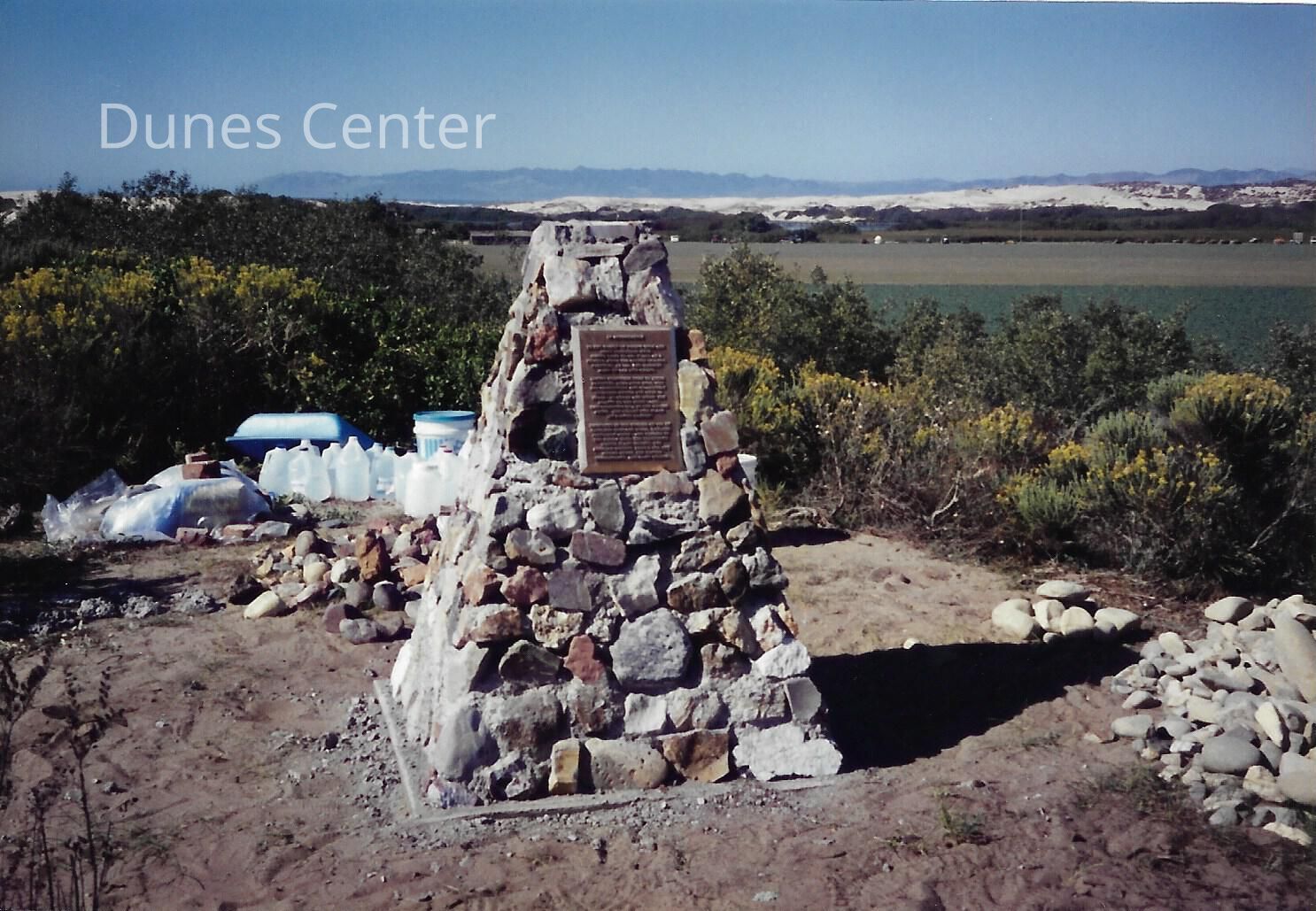 The completed monument on Coreopsis Hill for Joseph Enos and Mary Barcellos Enos for allowing people to lead hikers on their propertyto see the beautiful dune flowers, monument idea by Kathleen Goddard Jones, designed and constructed by Jack Beigle, Al Spierling, Norm Hammond, and Hal Shartz with Kathleen Goddard Jones supervising, 1994, 3.5" x 5" color photograph