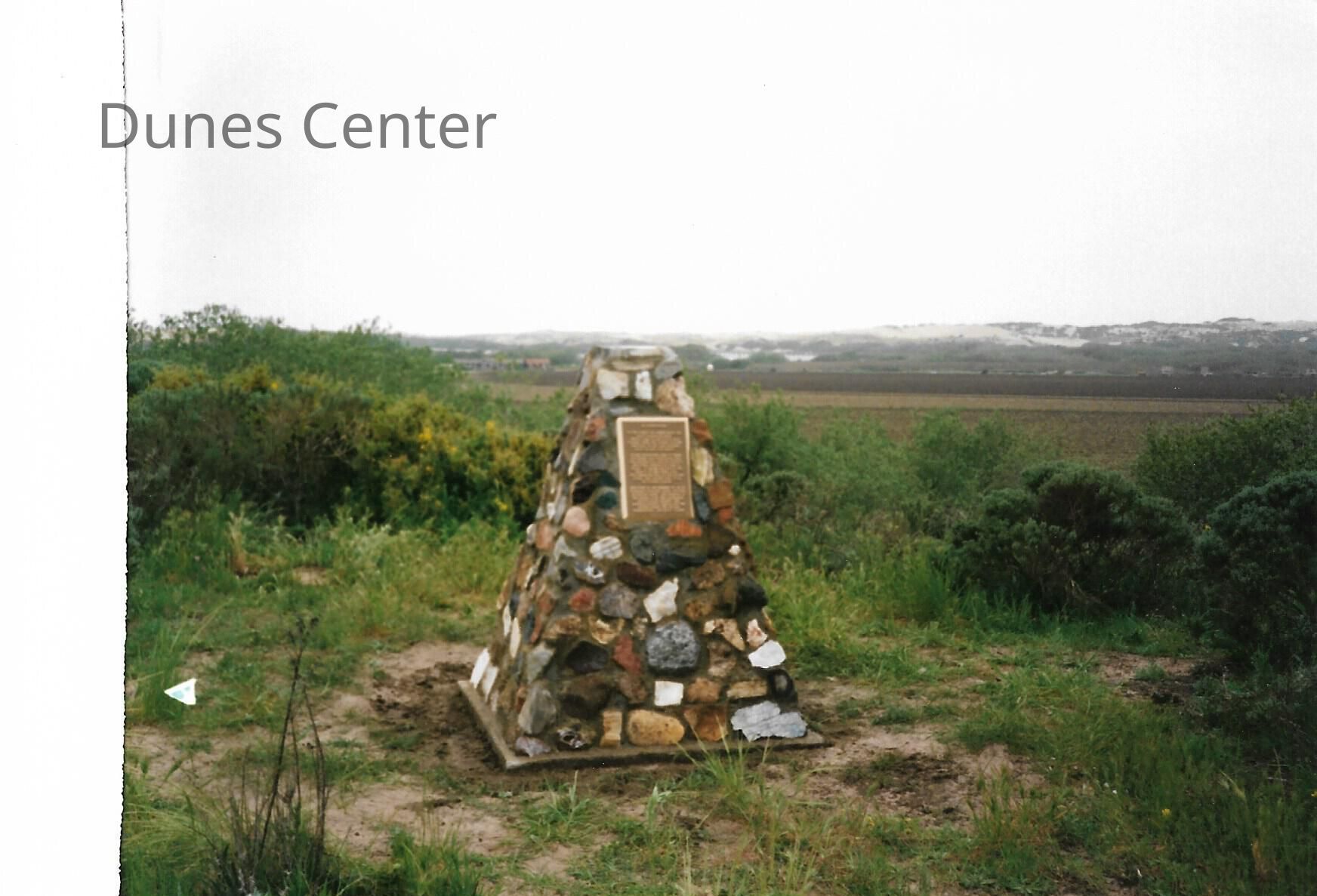 The completed monumnet on Coreopsis Hill for Joseph Enos and Mary Barcellos Enos for allowing people to lead hikers on their propertyto see the beautiful dune flowers, monument idea by Kathleen Goddard Jones, designed and constructed by Jack Beigle, Al Spierling, Norm Hammond, and Hal Shartz with Kathleen Goddard Jones supervising, 1994 - 4" x 6" color photographEntry/Object ID