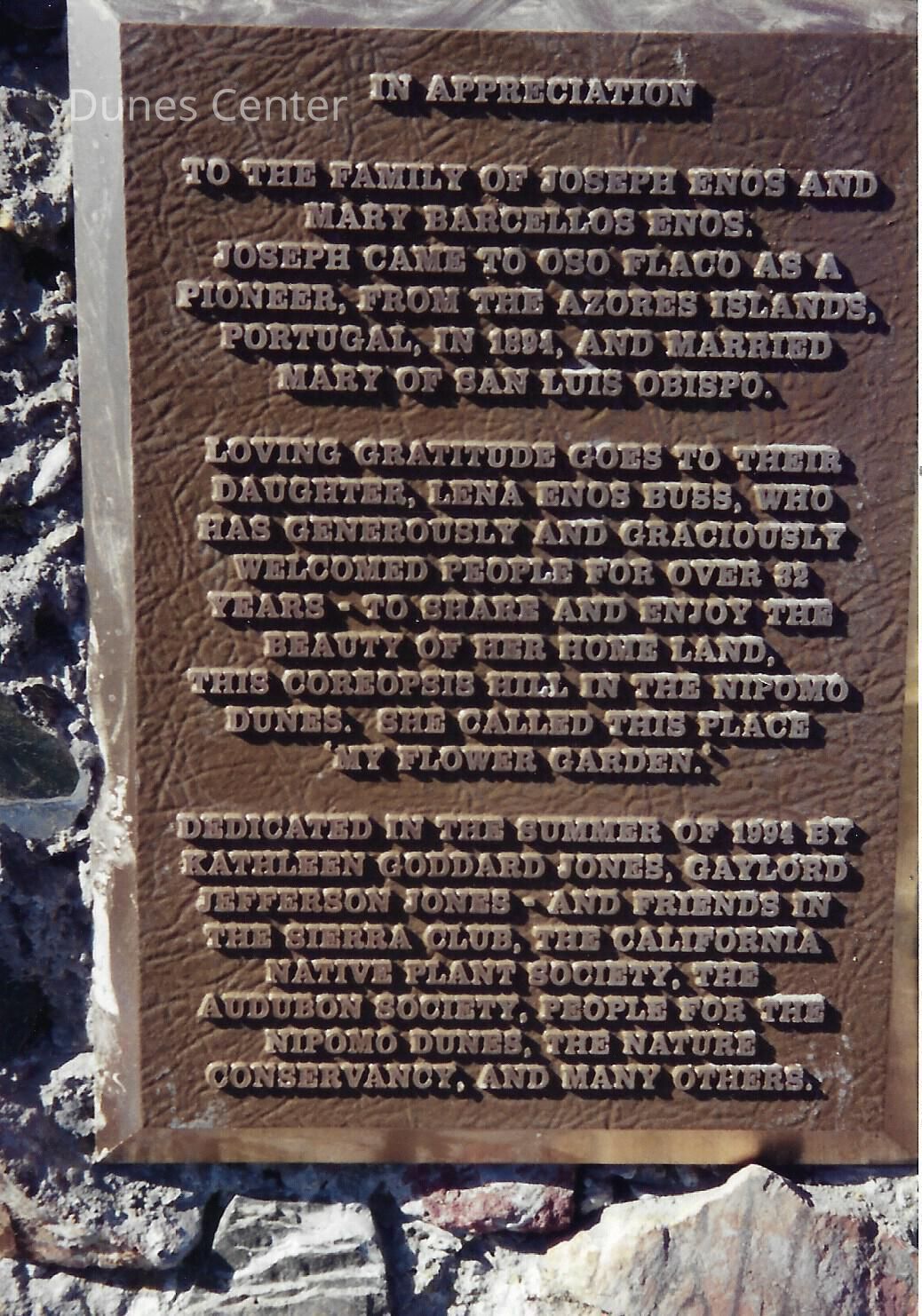 The completed monumnet on Coreopsis Hill for Joseph Enos and Mary Barcellos Enos for allowing people to lead hikers on their propertyto see the beautiful dune flowers, monument idea by Kathleen Goddard Jones, designed and constructed by Jack Beigle, Al Spierling, Norm Hammond, and Hal Shartz with Kathleen Goddard Jones supervising, 1994, 3.5" x 5" color photograph