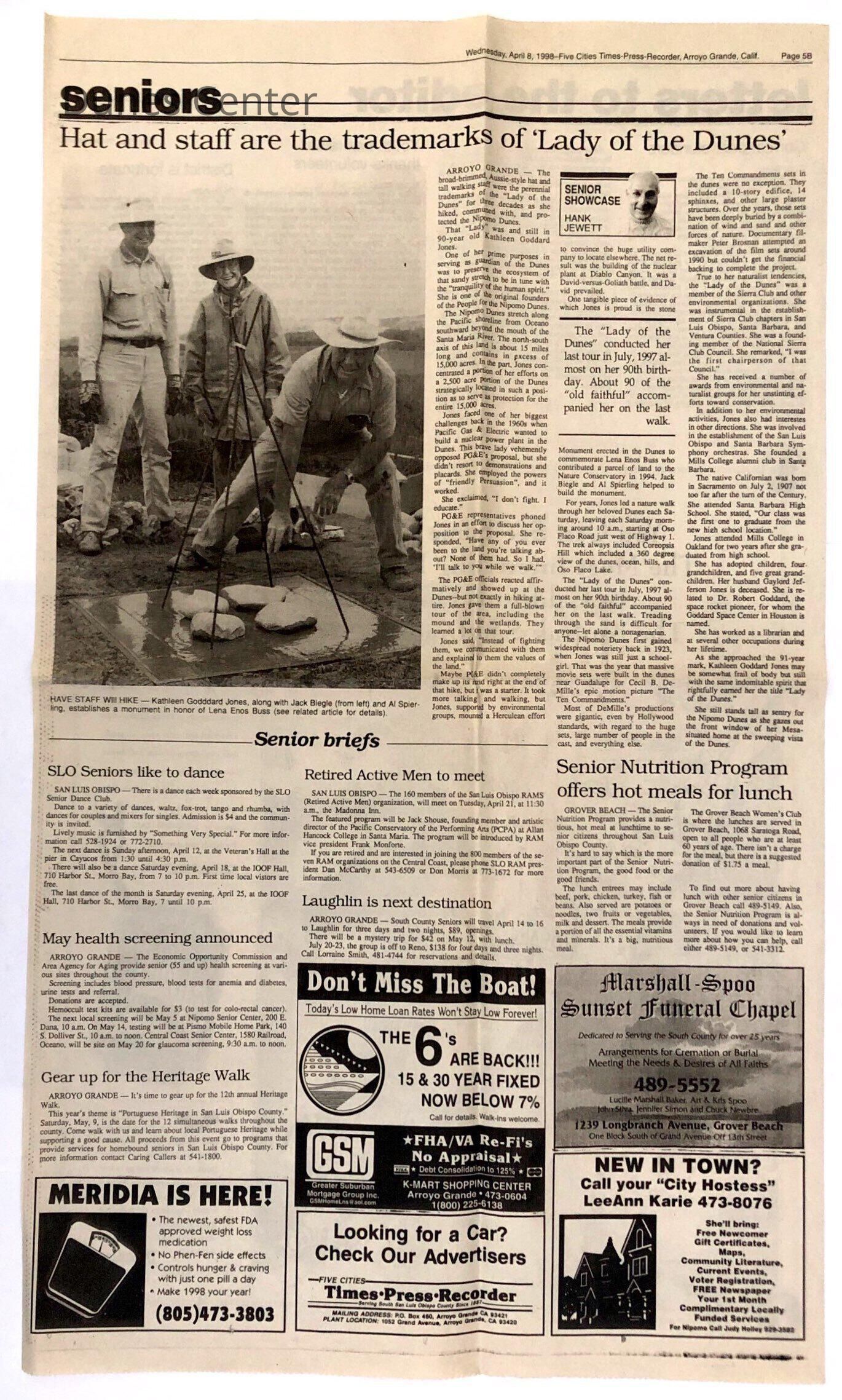 Article about Kathleen Goddard Jones, "Hat and staff are the trademark of 'Lady of the Dunes'", Wednesday April 8, 1998 Five Cities Times-Press-Recorder, Arroyo Grande, CA