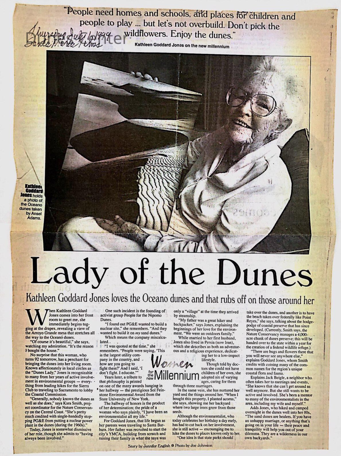 Article about Kathleen Goddard Jones, "Lady of the Dunes" by Jennifer English, Thursday July 1, 1999 Santa Maria Times