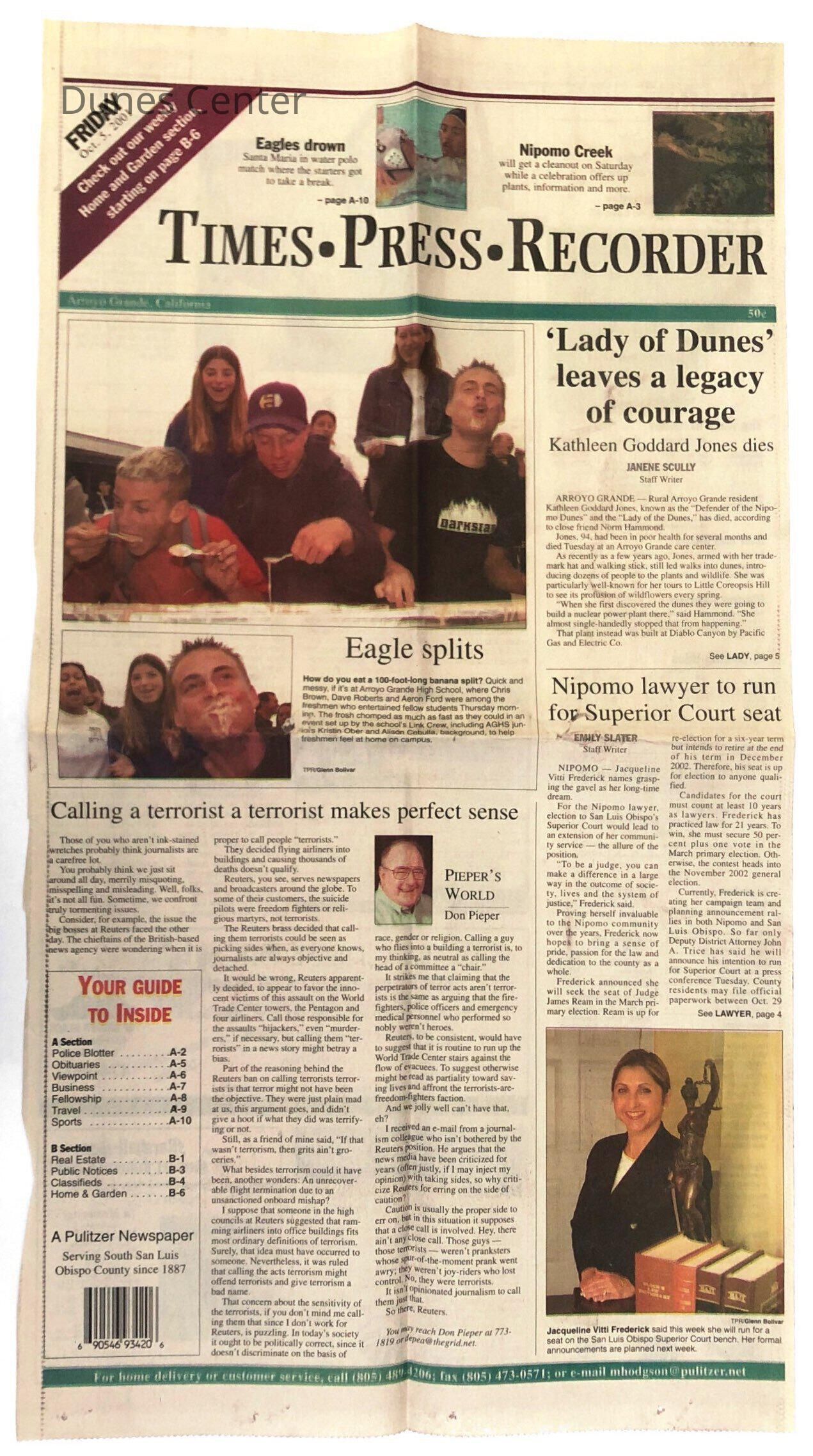 "'Lady of the Dunes' leaves a legacy of courage" Article by Janene Scully, Friday, Oct 5, Five Cities Times-Press-Recorder, Arroyo Grande, CA - 2001Entry/Object ID