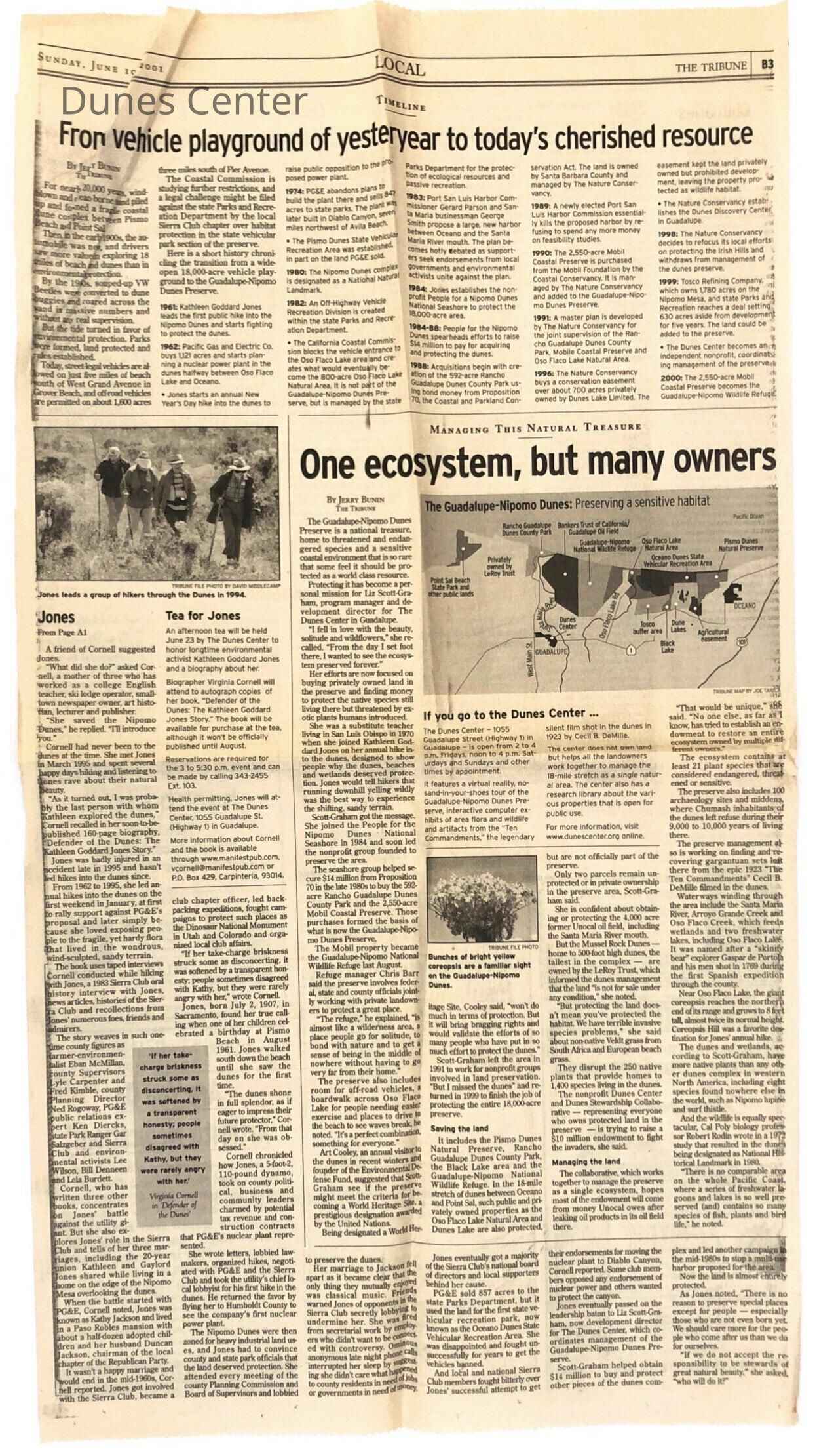 Article on Kathleen Goddard Jones with picture, Article about Guadalupe-Nipomo Dunes Preserve, "One ecosystem, but many owners" by Jerry Bunin, Sunday, June 10, 2001 The Tribune