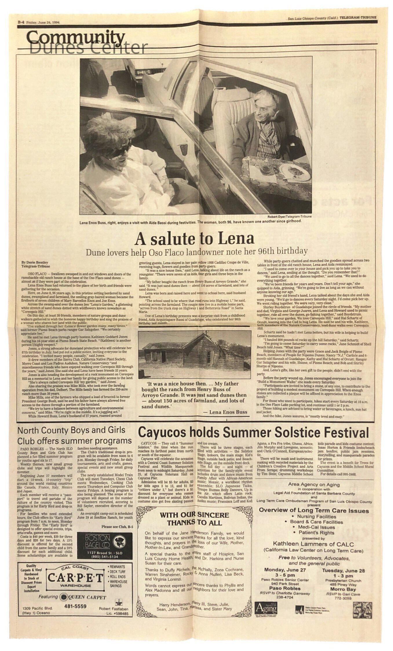 Friday, June 24, San Luis Obsipo County Telegram-Tribune - "A salute to Lena: Dune lovers help Oso Flaco landowner note her 96th birthday" Article by Dorie Bentley - 1994Entry/Object ID