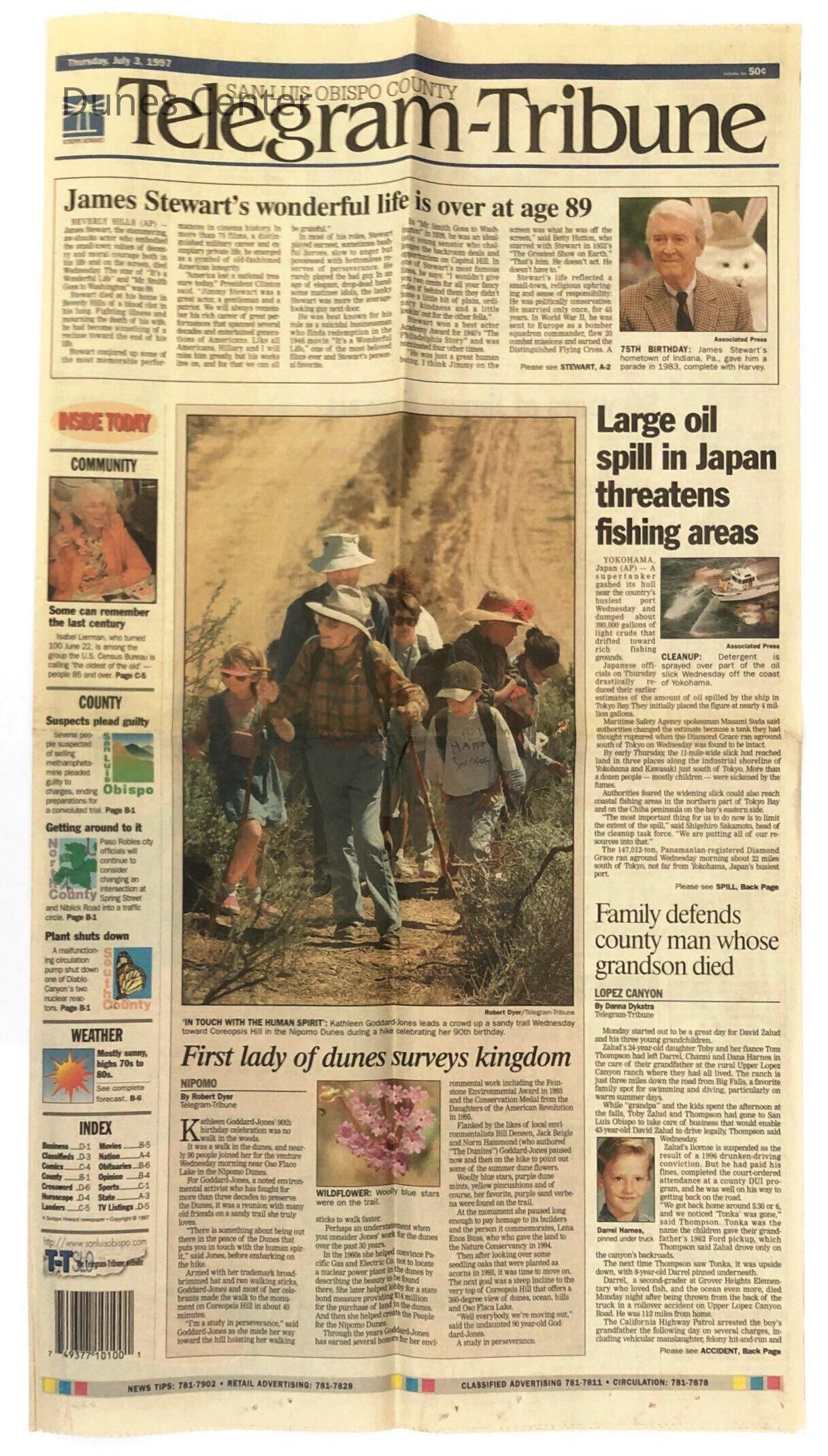 "First lady of the dunes surveys kingdom" Article by Robert Dyer, Photo of Kathleen Goddard Jones included, July 3, San Luis Obsipo County Telegram-Tribune - 1997Entry/Object ID