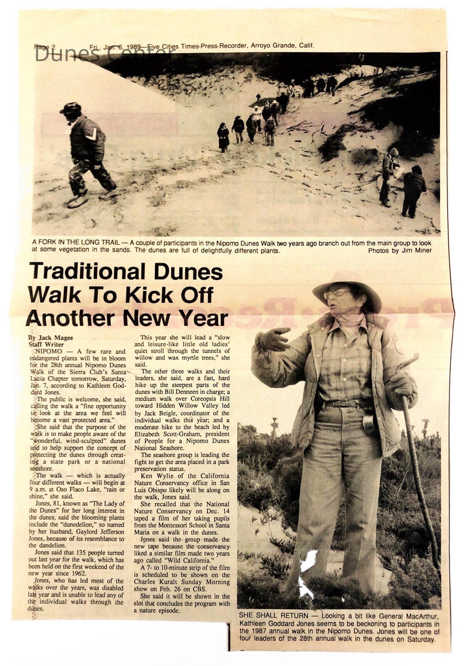 "Traditional Dunes Walk To Kick Off Another New Year" Article by Jack Magee, Photo of Kathleen Goddard Jones included, Friday, January 6, Five Cities Times-Press-Recorder, Arroyo Grande, CA - 1989Entry/Object ID
