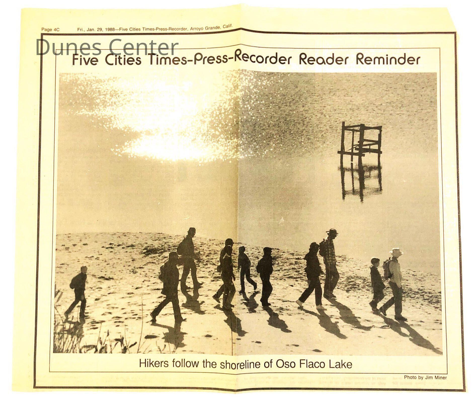 Photo taken by Jim Miner showing "Hikers follow the Shoreline of Oso Flaco Lake"Friday, January 29, 1988, Five Cities Times-Press-Recorder, Arroyo Grande, CA