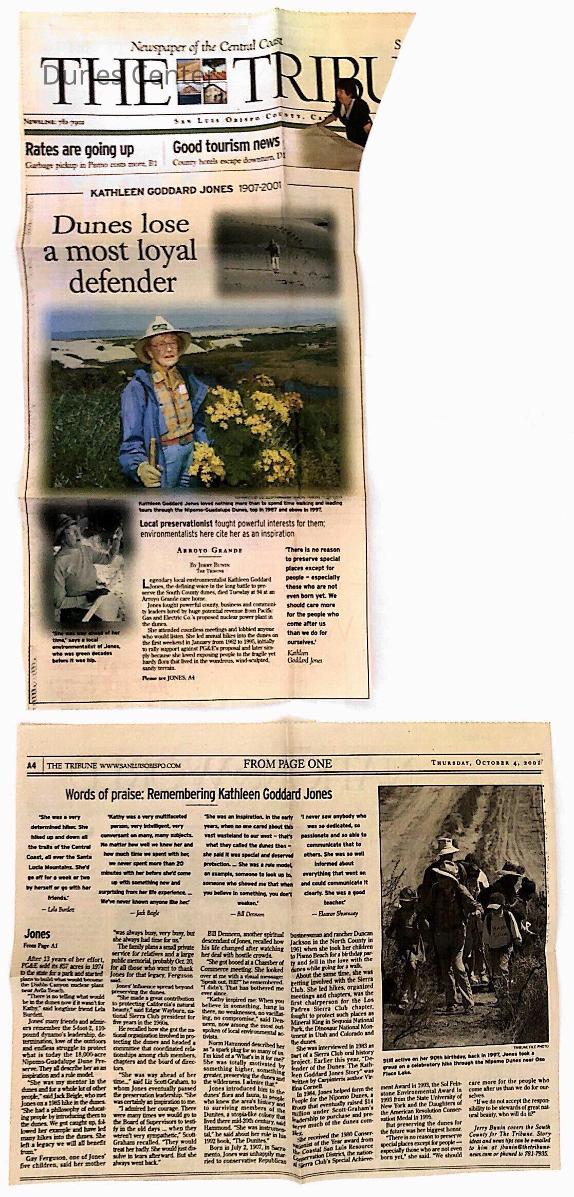 Artcile in memory of Kathleen Goddard Jones, "Dunes lose a most loyal defender" Article by Jerry Bunin, Thursday, October 4, 2001 San Luis Obsipo County The Tribune