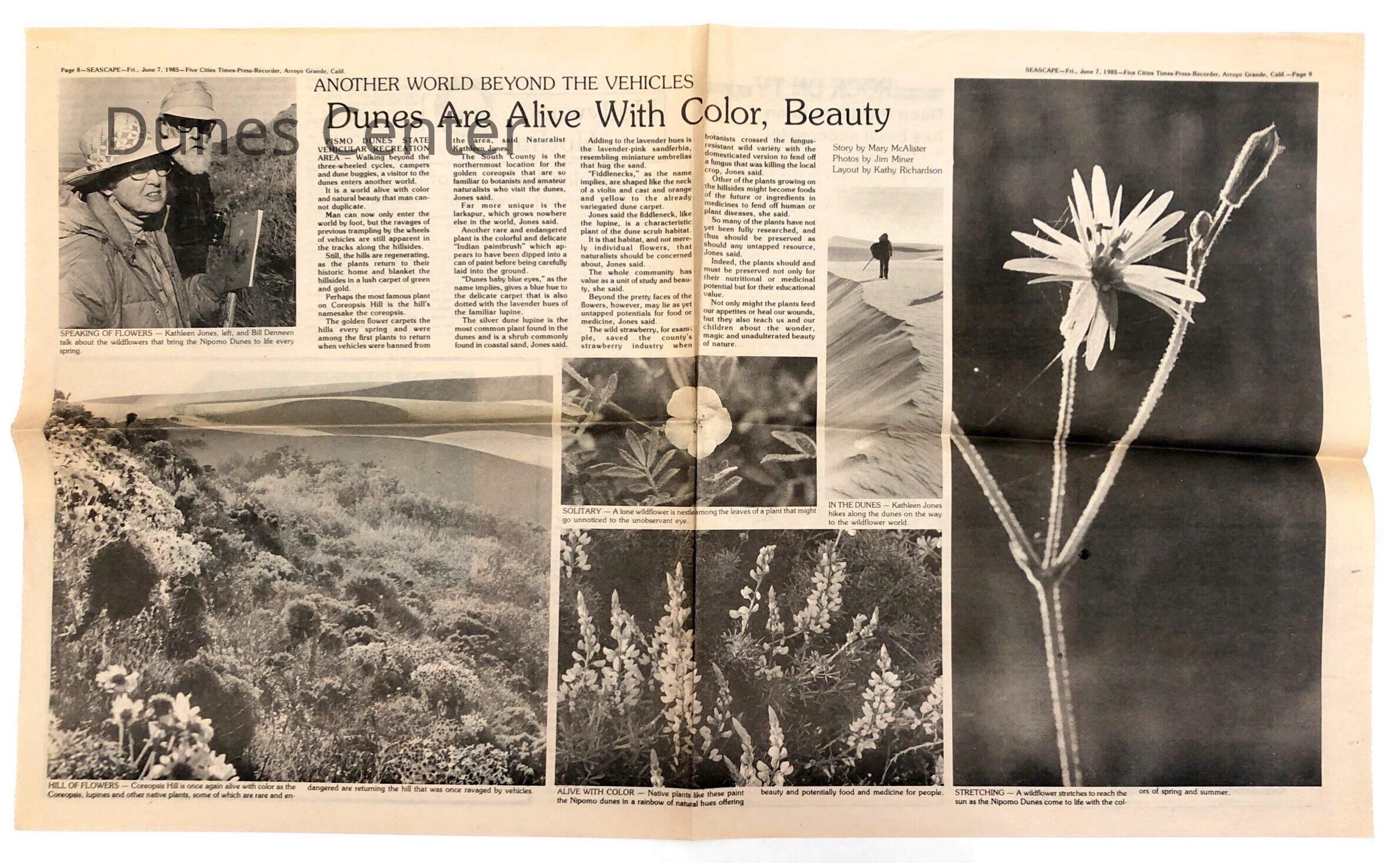 "Dunes are alive with color, beauty" Article by Mary McAlister, Photos by Jim Miner, Layout by Kathy Richardson, Photo of Kathleen Goddard Jones included, Friday, June 7, Five Cities Times-Press-Recorder, Arroyo Grande, CA - 1985Entry/Object ID