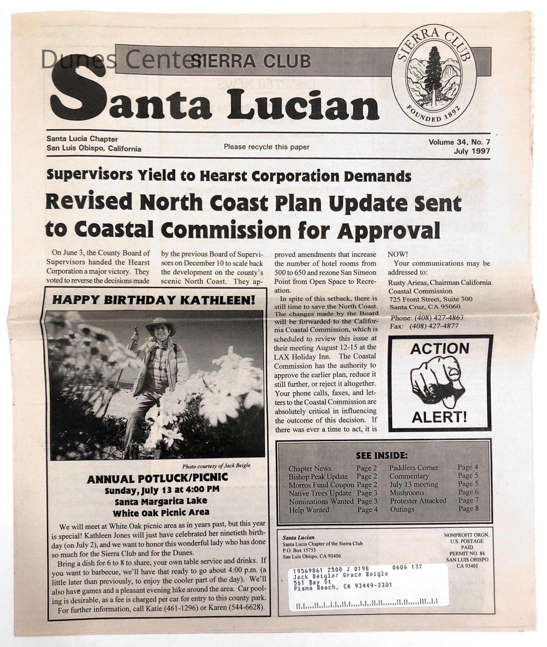 Annual Birthday Potluck invitation for Kathleen Goddard Jones at Santa Margarita Lake, Sierra Club Santa Lucian, Santa Lucia Chapter San Luis Obsipo, CA, Volume 34, No. 7, July 1997