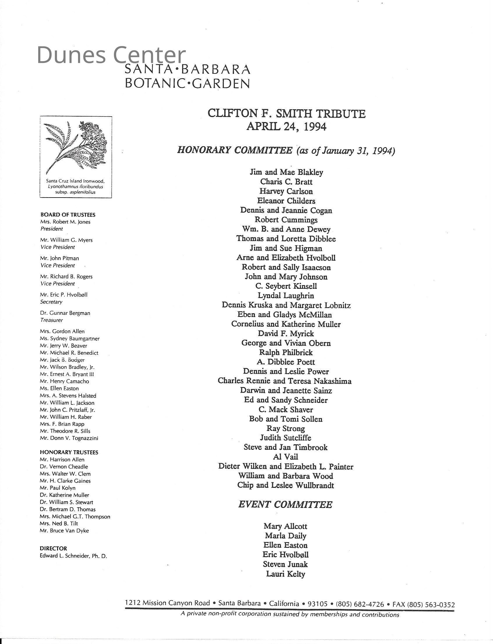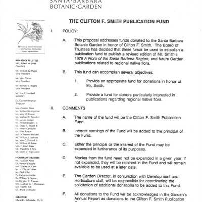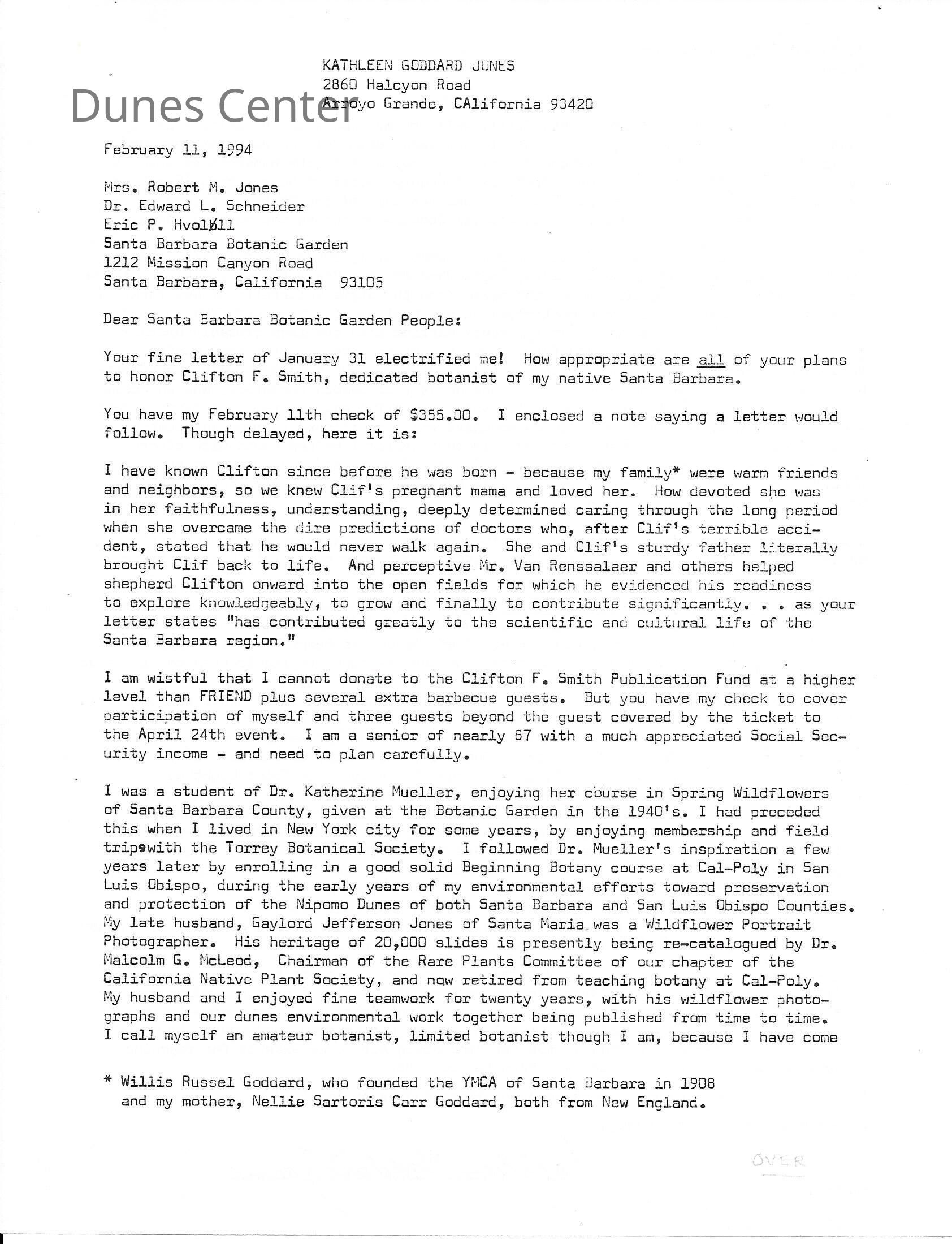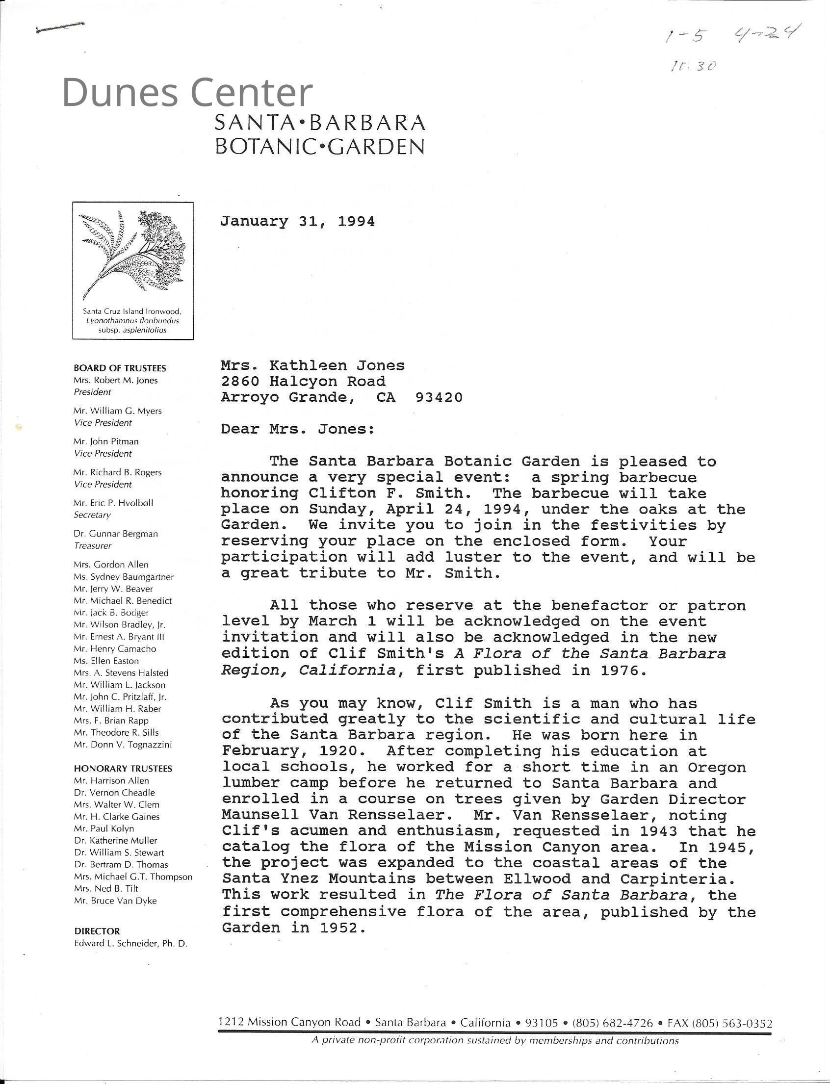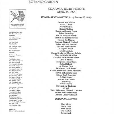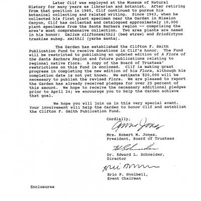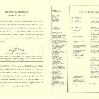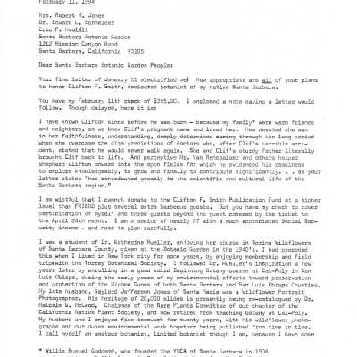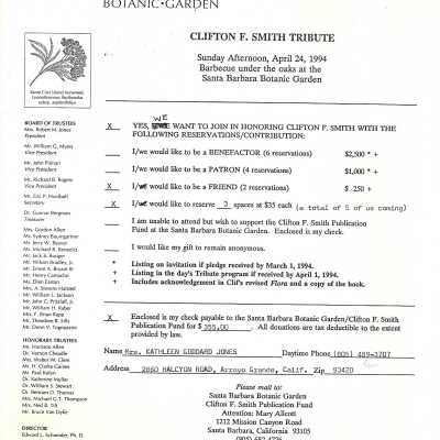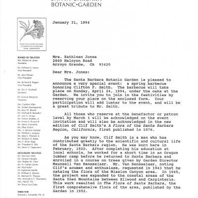 Clifton F. Smith Tribute program and schedule of events, Letter from Kathleen Goddard Jones to Santa Barbara Botanic Garden People concerning her donation to the foundation and memeories of Clifton F. Smith, February 11 - 1994Entry/Object ID