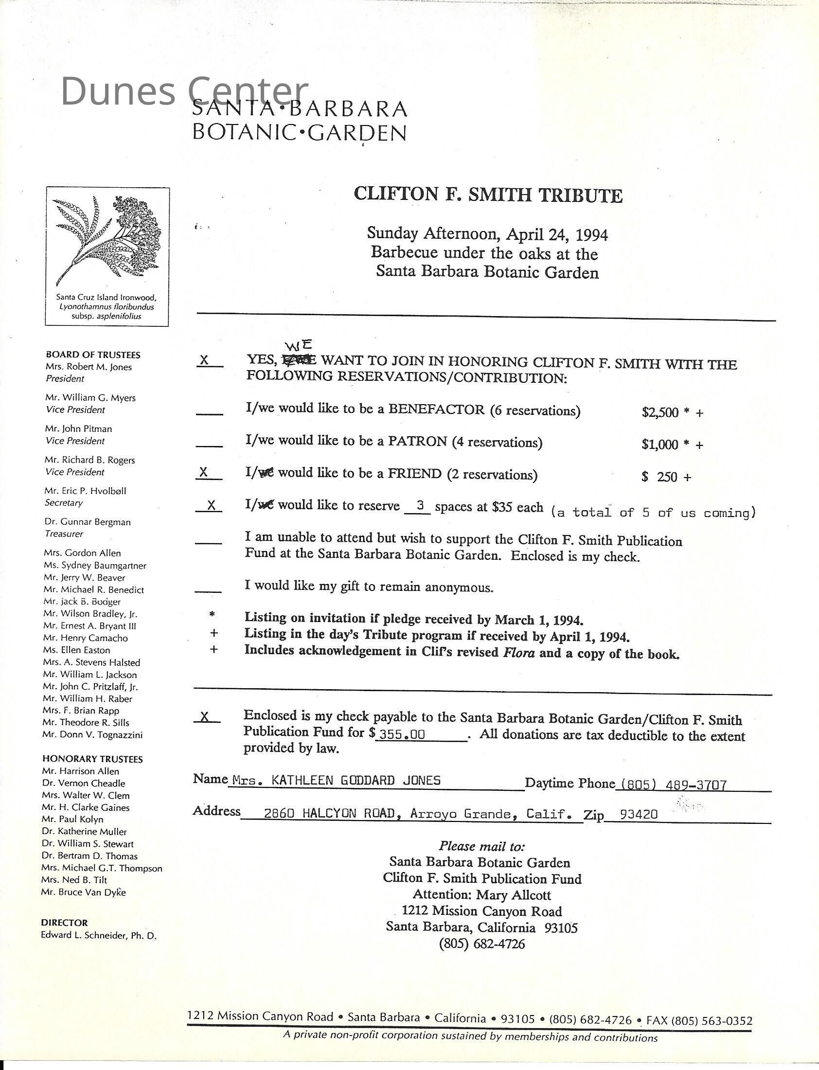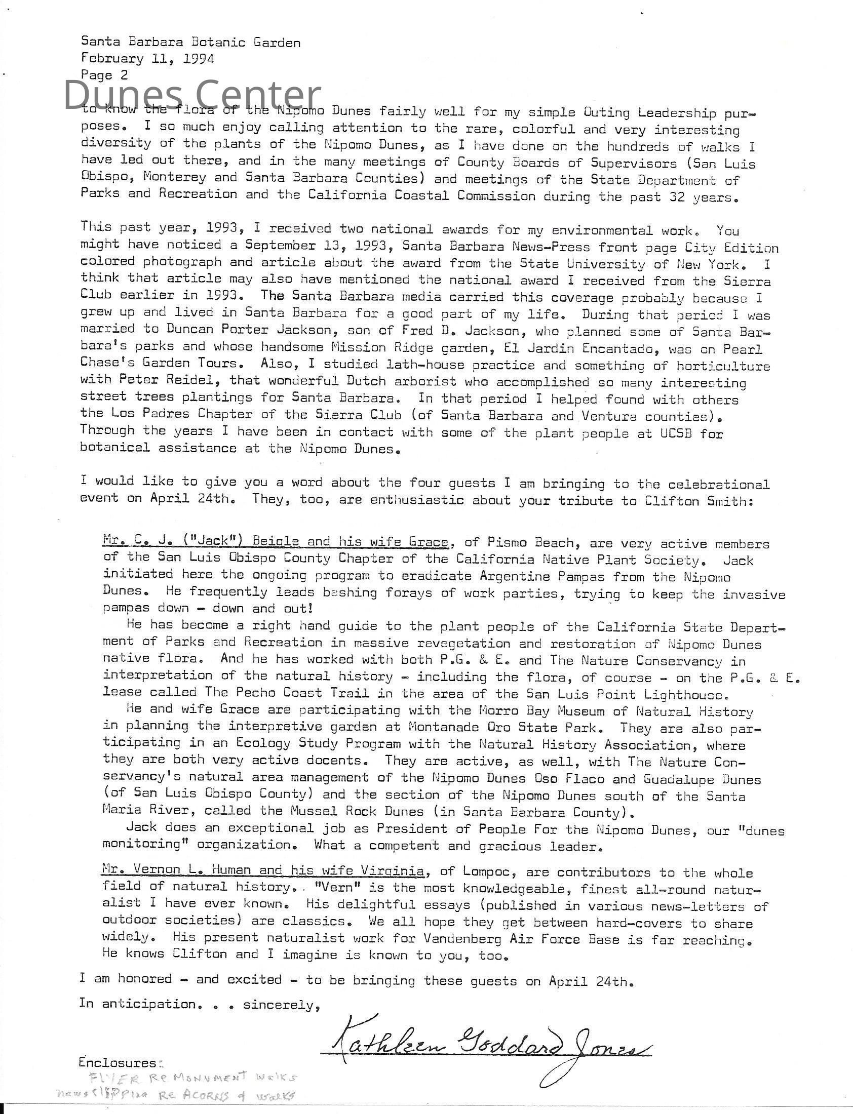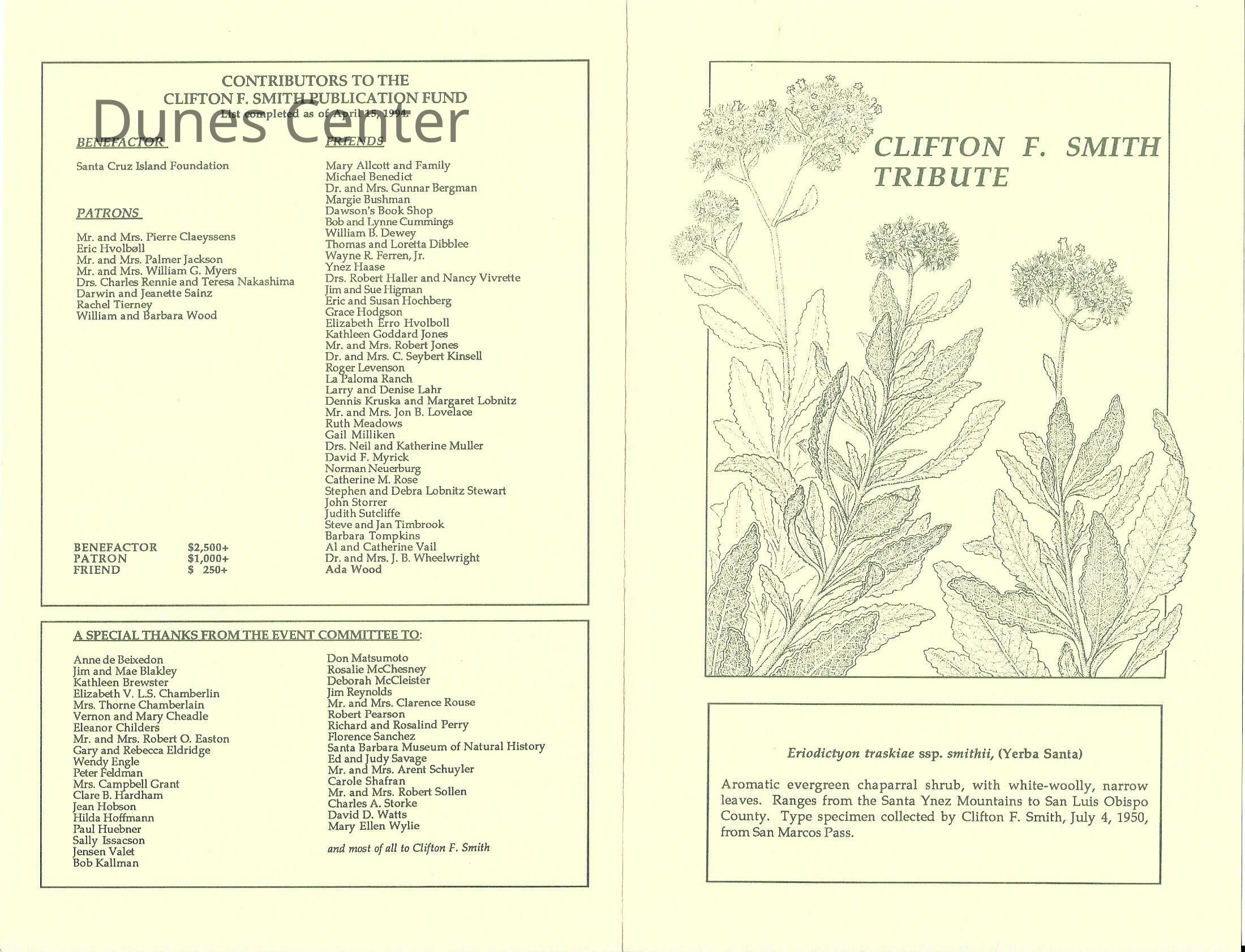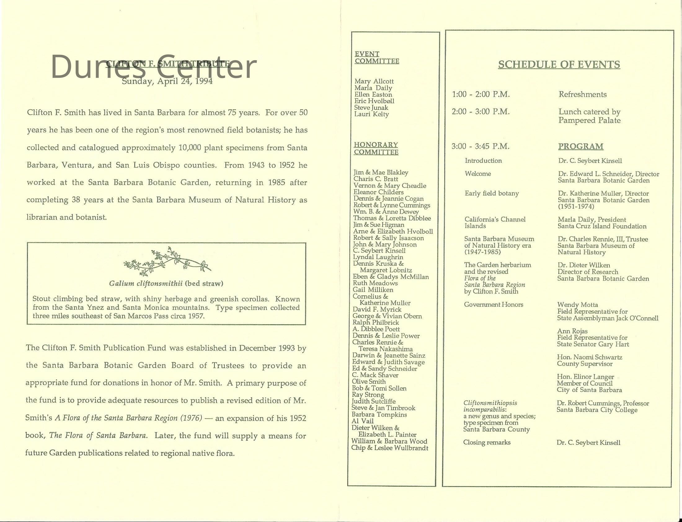 Clifton F. Smith Tribute program and schedule of events, Letter from Kathleen Goddard Jones to Santa Barbara Botanic Garden People concerning her donation to the foundation and memeories of Clifton F. Smith, February 11 - 1994Entry/Object ID