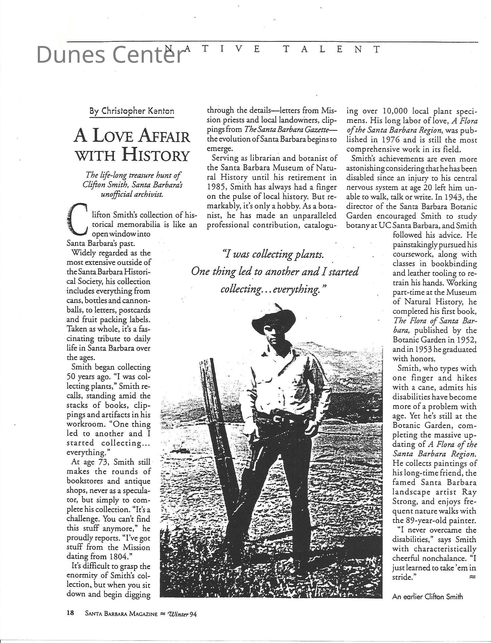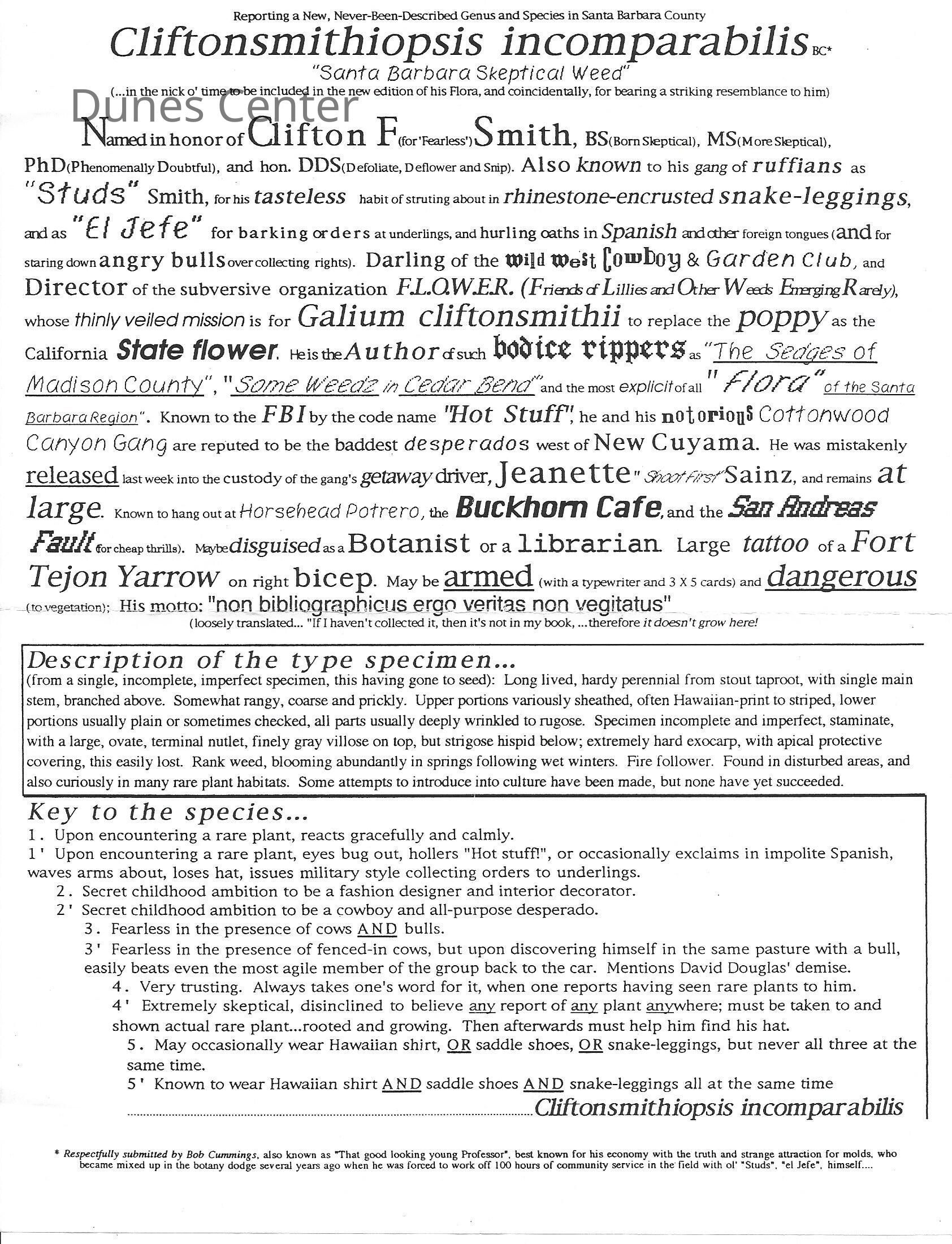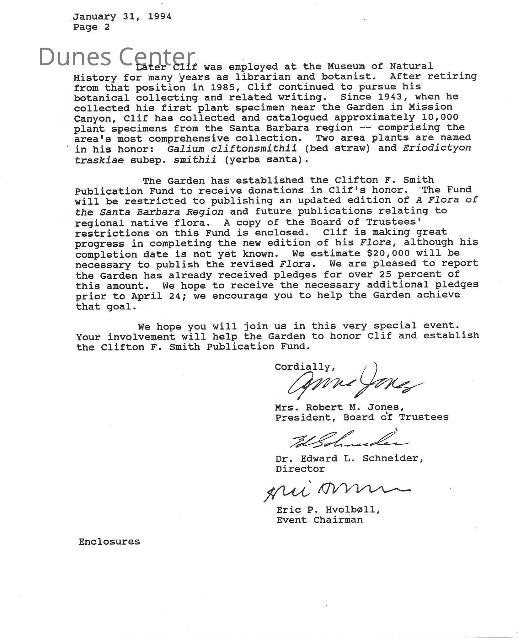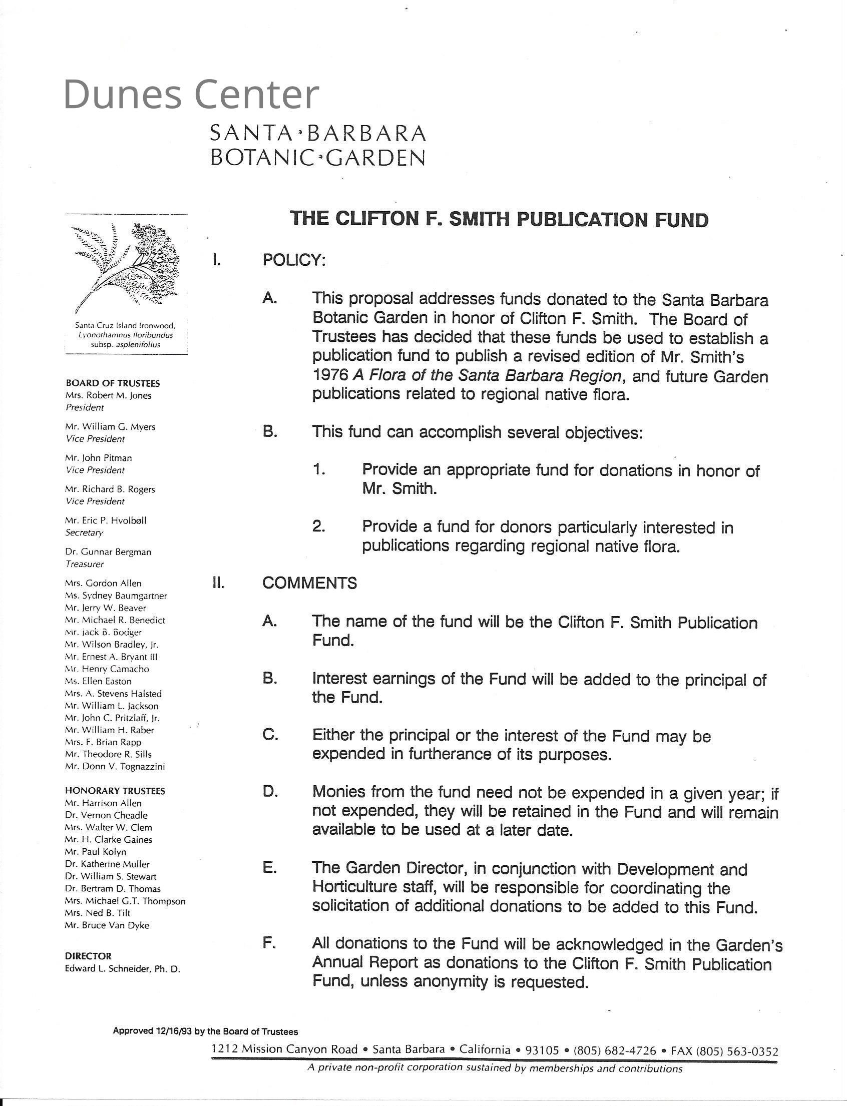 Clifton F. Smith Tribute program and schedule of events, Letter from Kathleen Goddard Jones to Santa Barbara Botanic Garden People concerning her donation to the foundation and memeories of Clifton F. Smith, February 11 - 1994Entry/Object ID