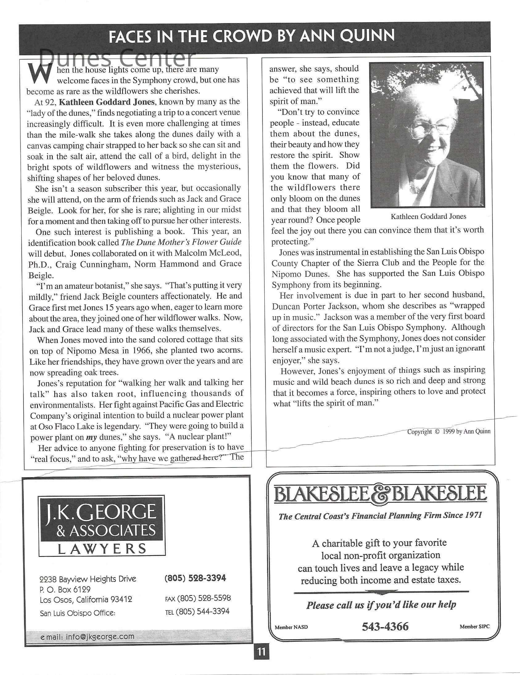 "Faces in the Crowd by Ann Quinn" Tribute to Kathleen Goddard Jones, October 9, 1999, San Luis Obispo Symphony