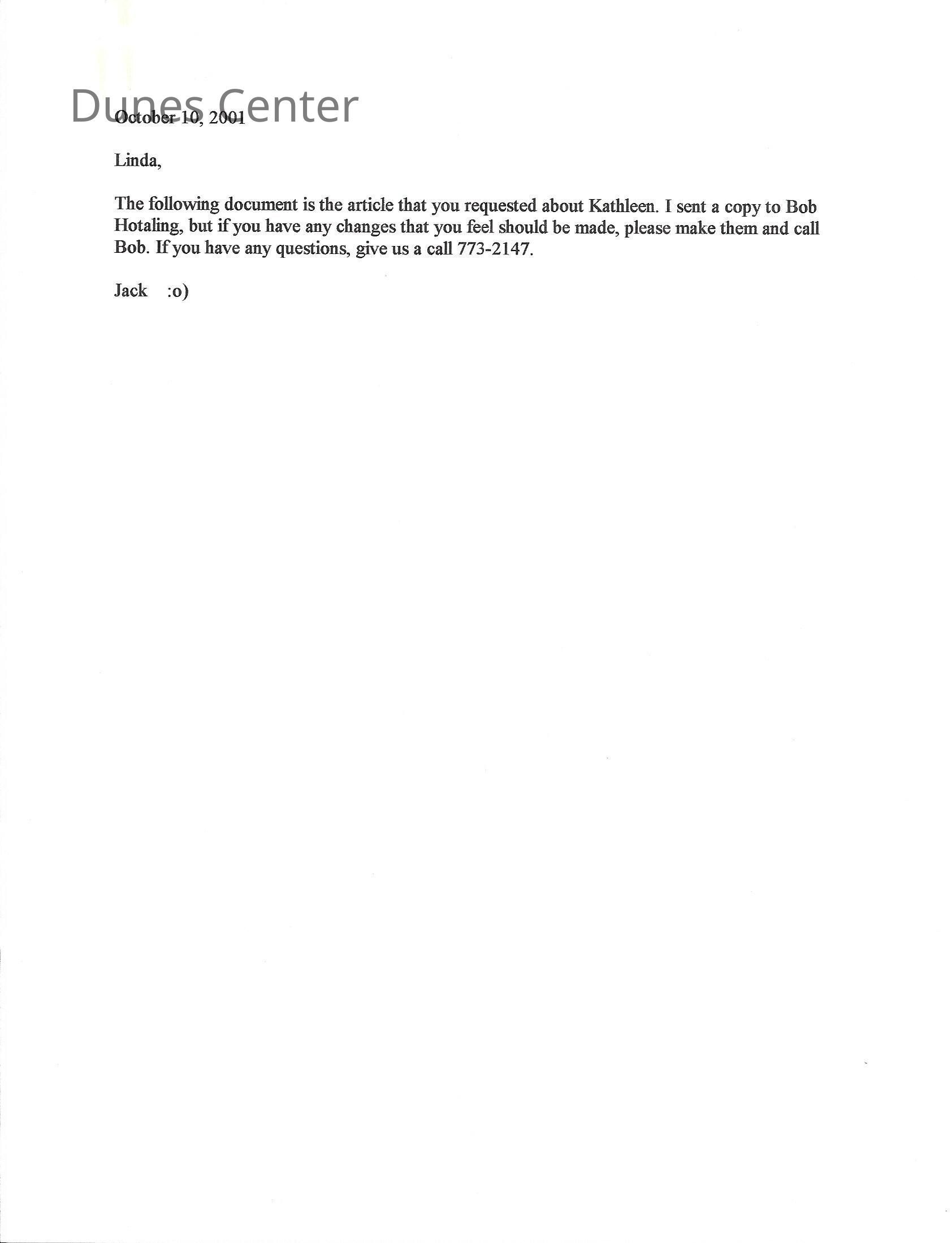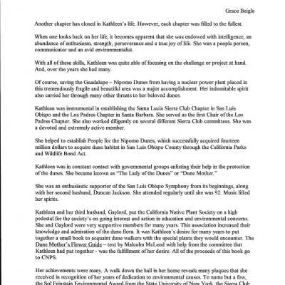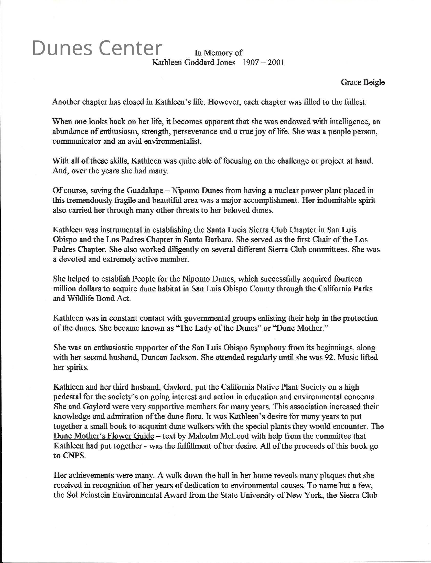 Artcile "In Memory of Kathleen Goddard Jones 1907-2001" by Grace Beigle sent to Linda from Jack BeigleEntry/Object ID