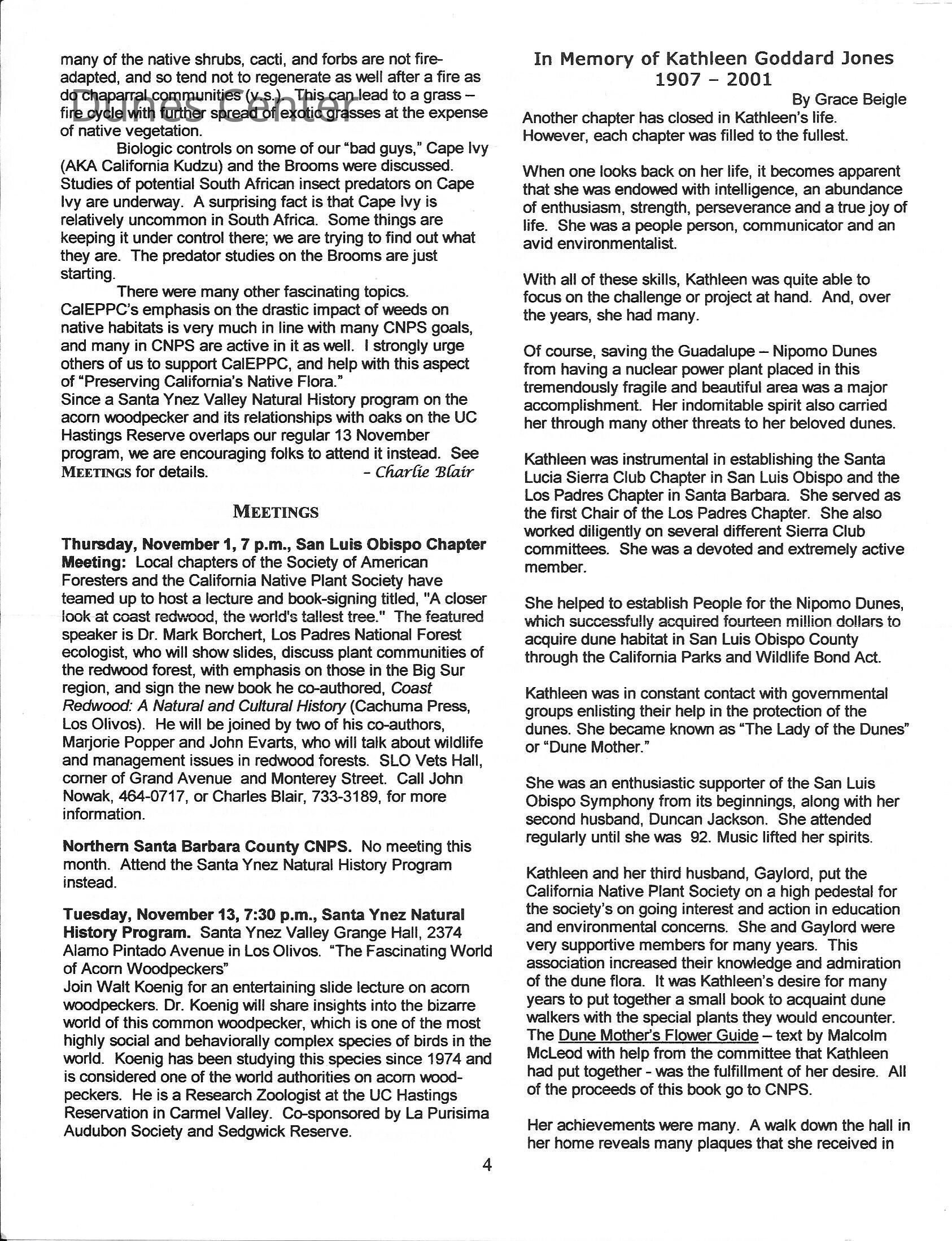 "In Memory of Kathleen Goddard Jones 1907-2001" by Grace Beigle in California Native Plant Society San Luis Obispo Chapter Newsletter