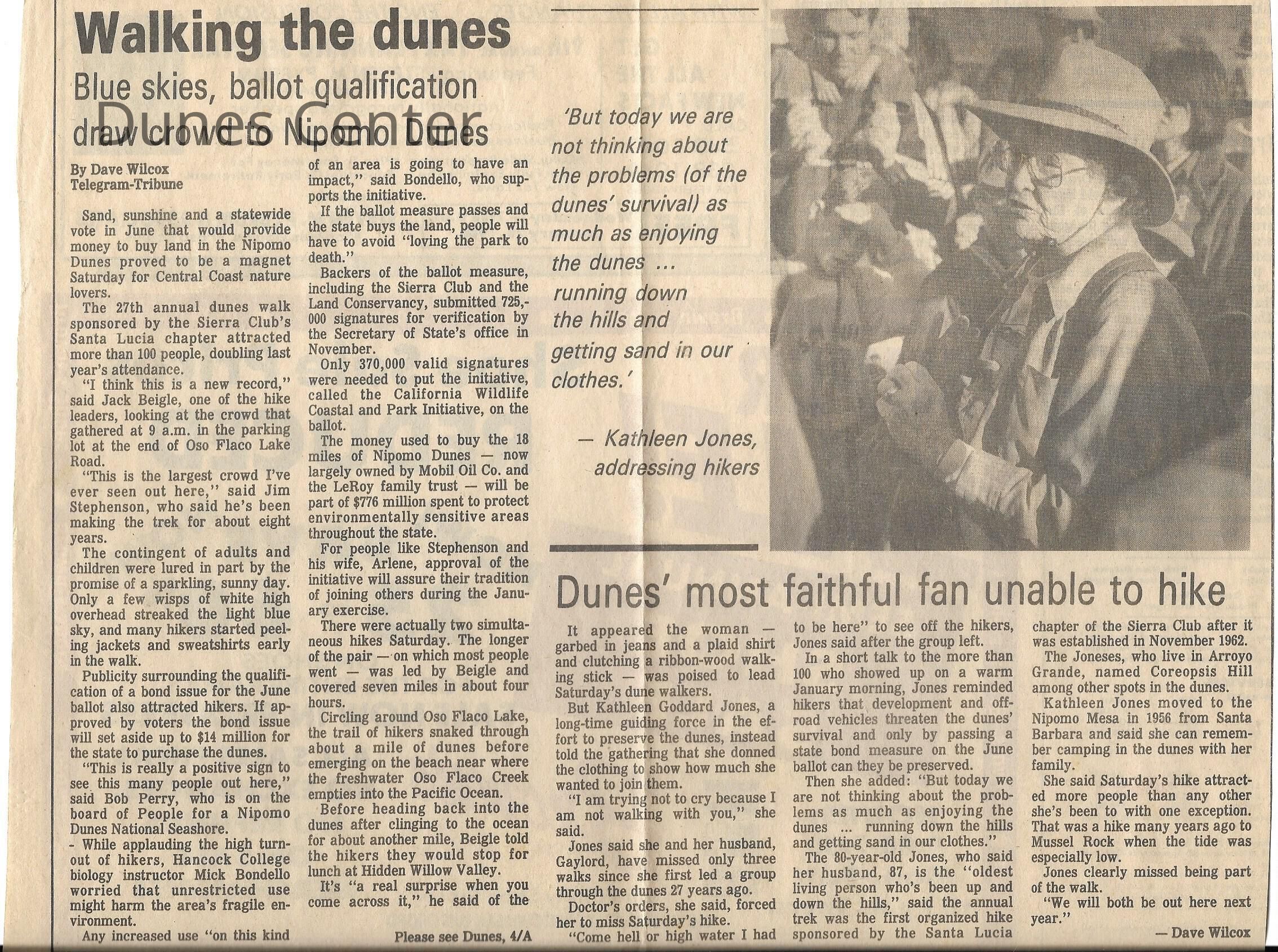 "Walking the Dunes" Article by Dave Wilcox, photo of Kathleen Goddard Jones included, Undated, San Luis Obsipo County Telegram-Tribune