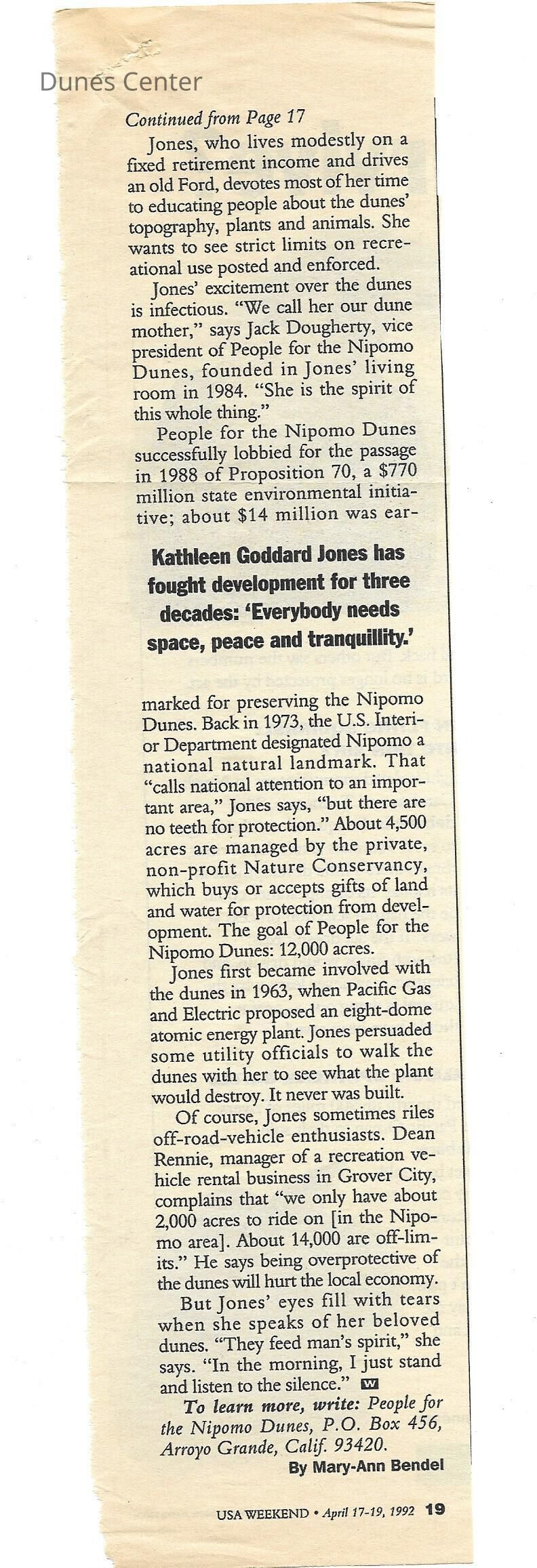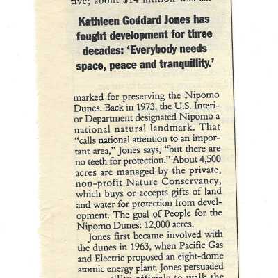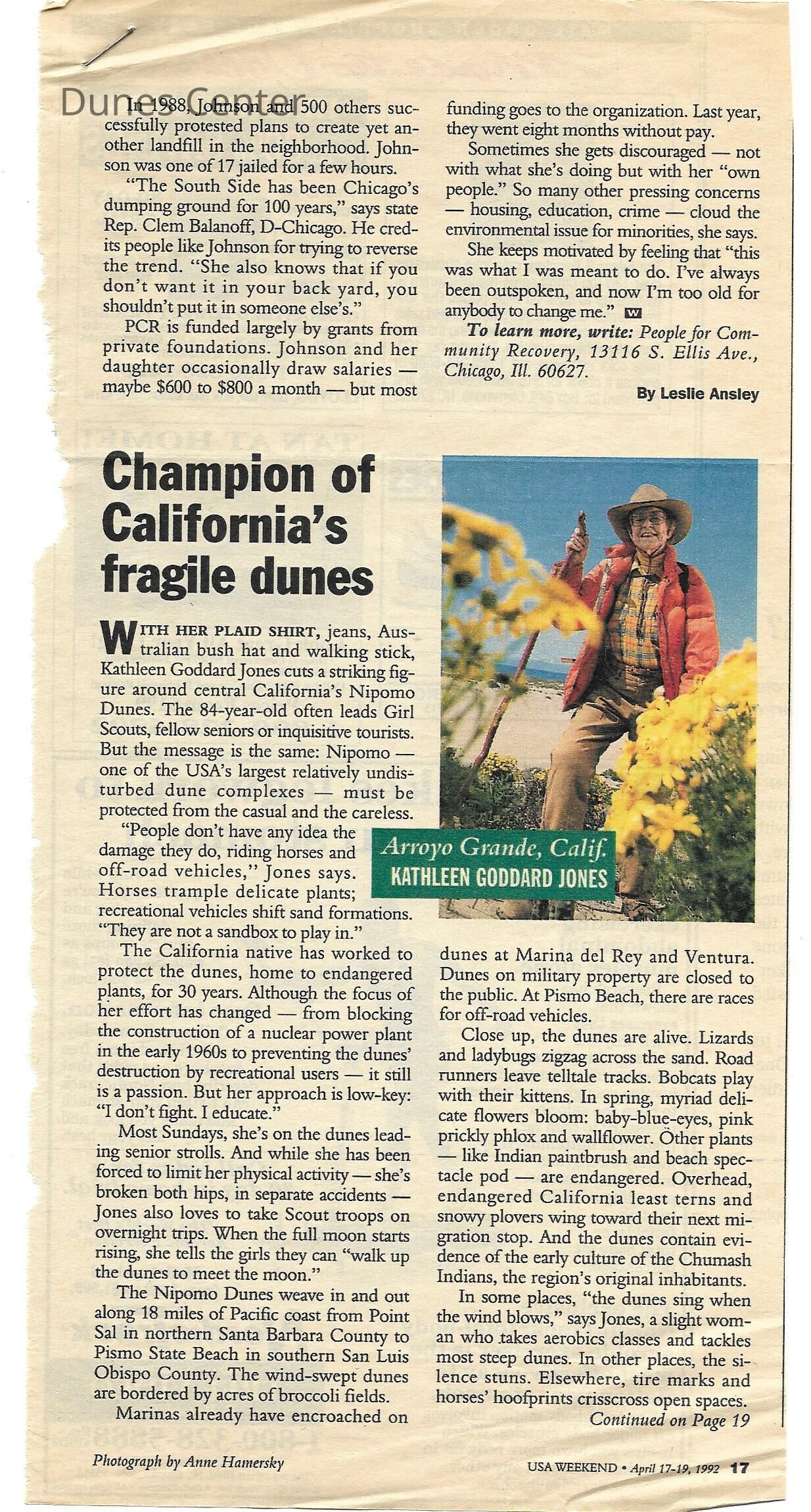 Champion of California's fragile dunes by Mary-Ann Bendel, Photo of Kathleen Goddard Jones included taken by Anne Hamersky, April 19, 1992, USA Weekend