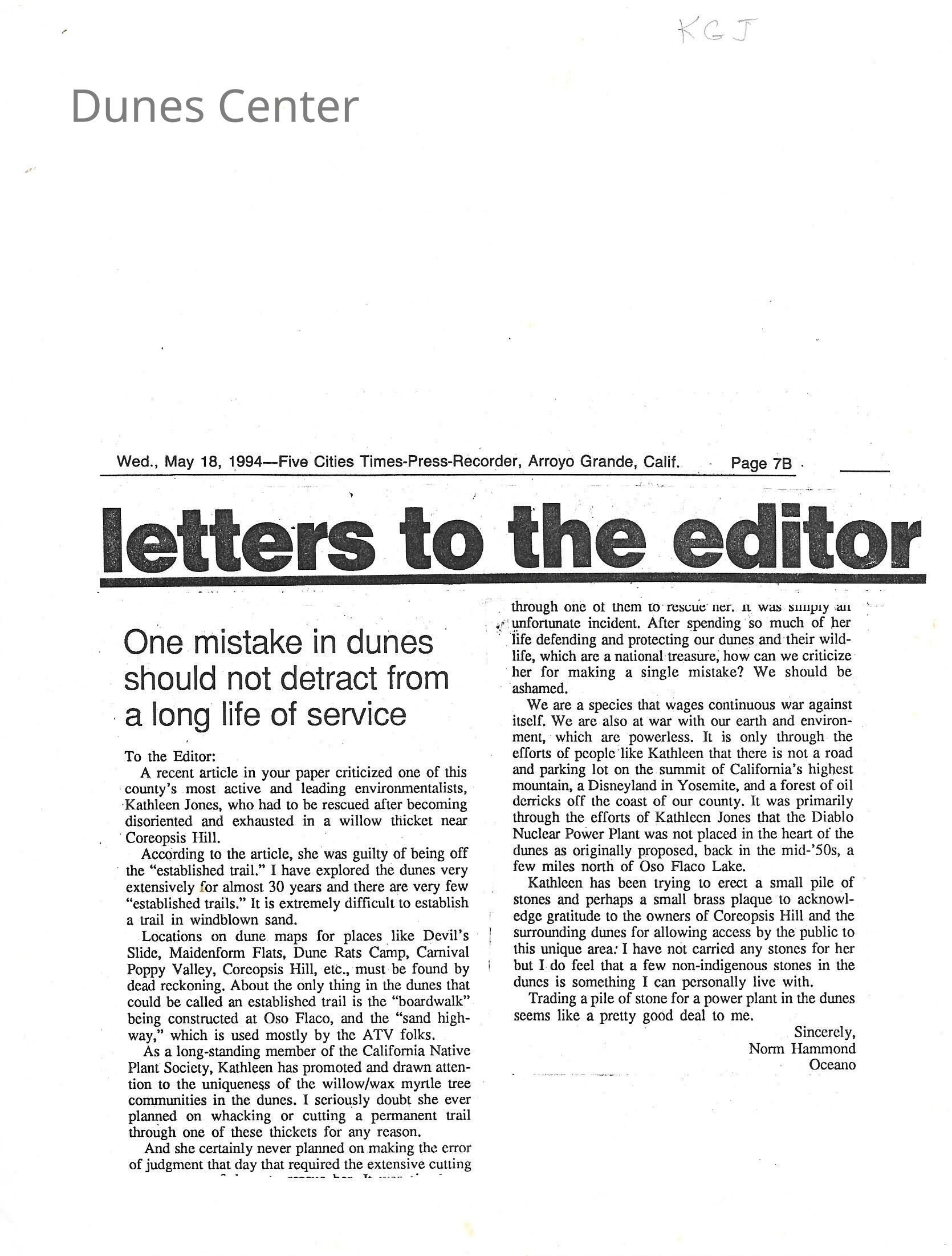 "One mistake in dunes should not detract from a long life of service" Letter to the editor by Norm Hammond, deffending Kathleen Goddard Jones, Wednesday, May 18, Five Cities Times-Press-Recorder, Arroyo Grande, CA - 1994Entry/Object ID