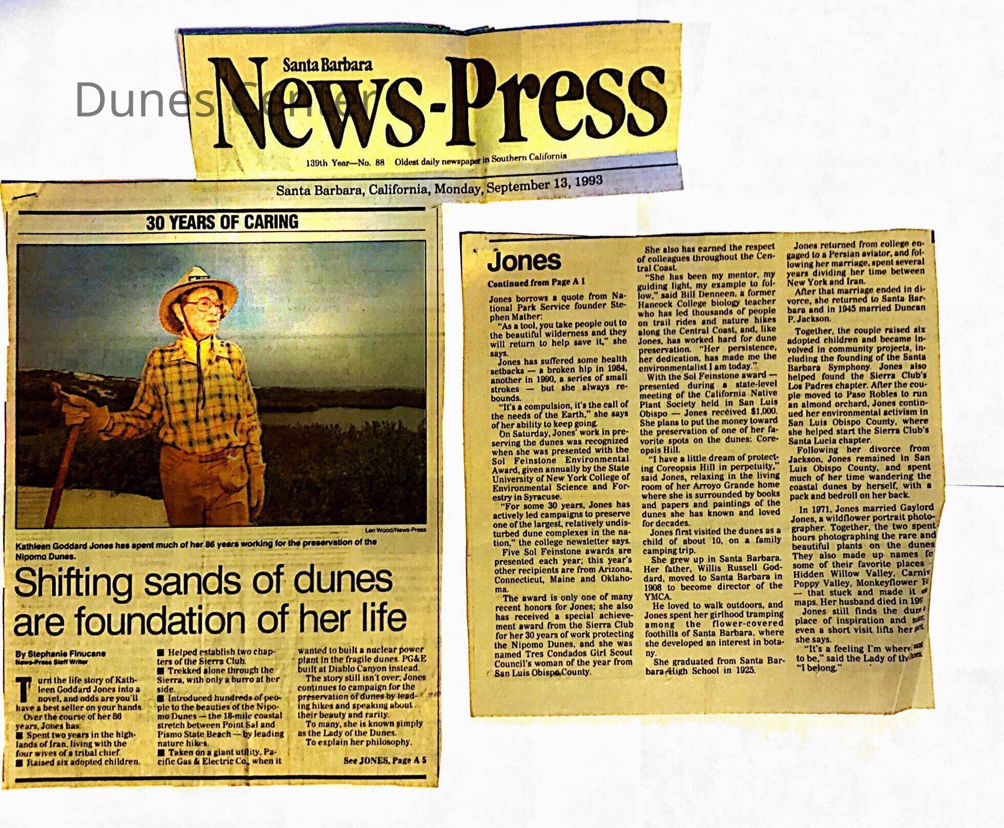 "Shifting sands of dunes are foundation of her life" by Stephabie Flnucane, photo of Kathleen Goddard Jones included, Monday, September 13, 1993, Santa Barbara News-Press