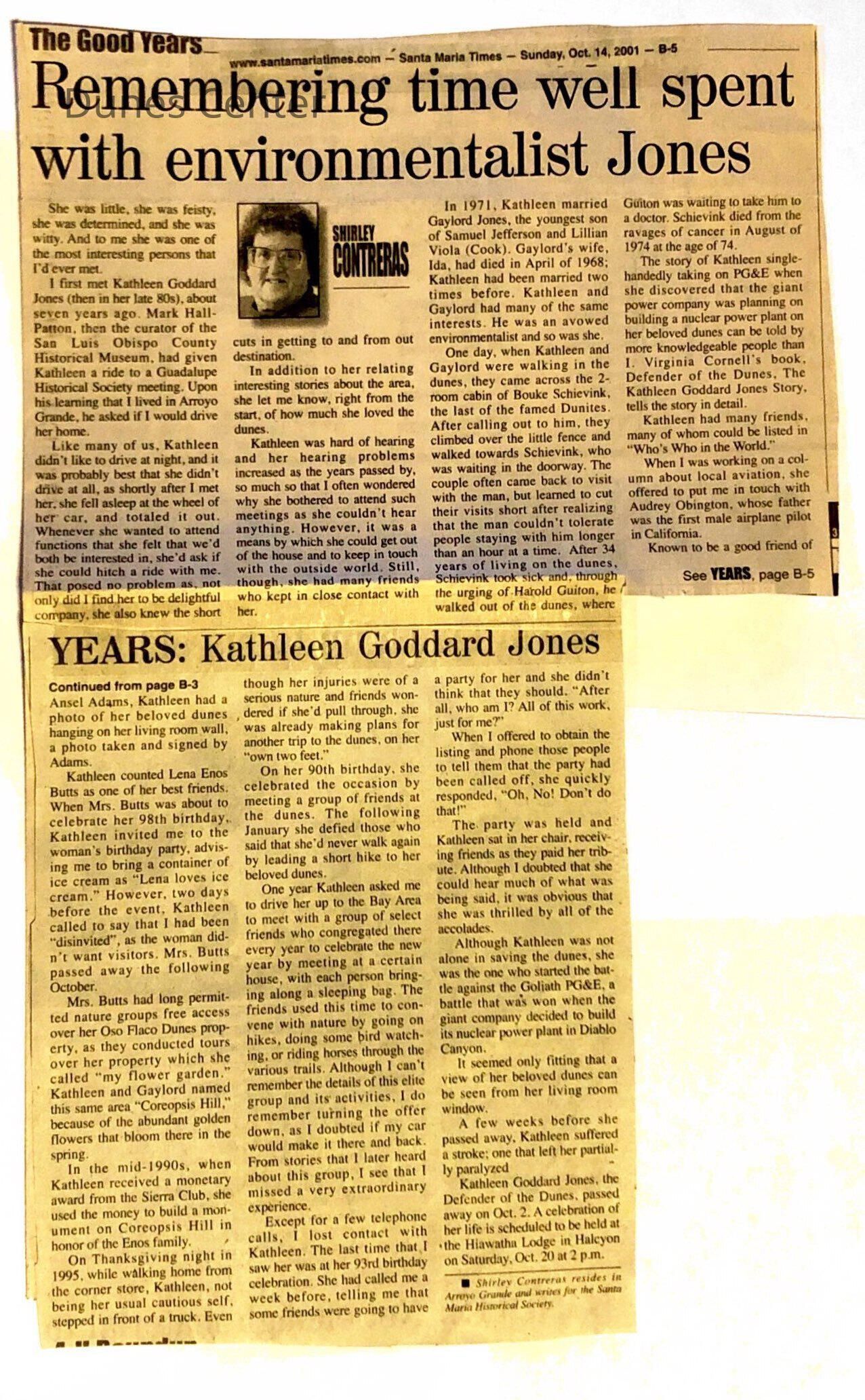 "Remembering time well spent with enviornmentalist Jones" by Shirley Contreras, Sunday, October 14, 2001, Santa Maria Times
