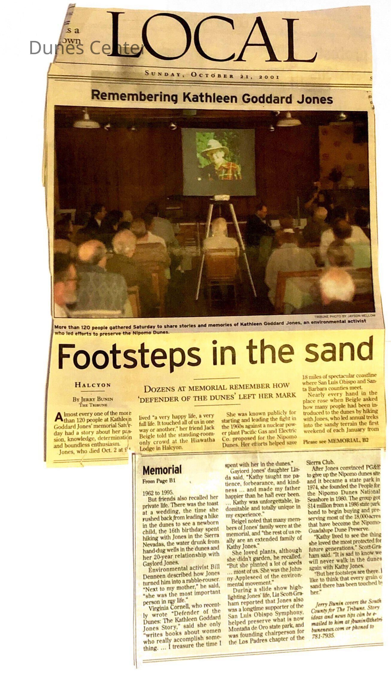"Remembering Kathleen Goddard Jones: Footsteps in the sand" Article by Jerry Bunin, Sunday, October 21, 2001, The Tribune San Luis Obispo County, CA