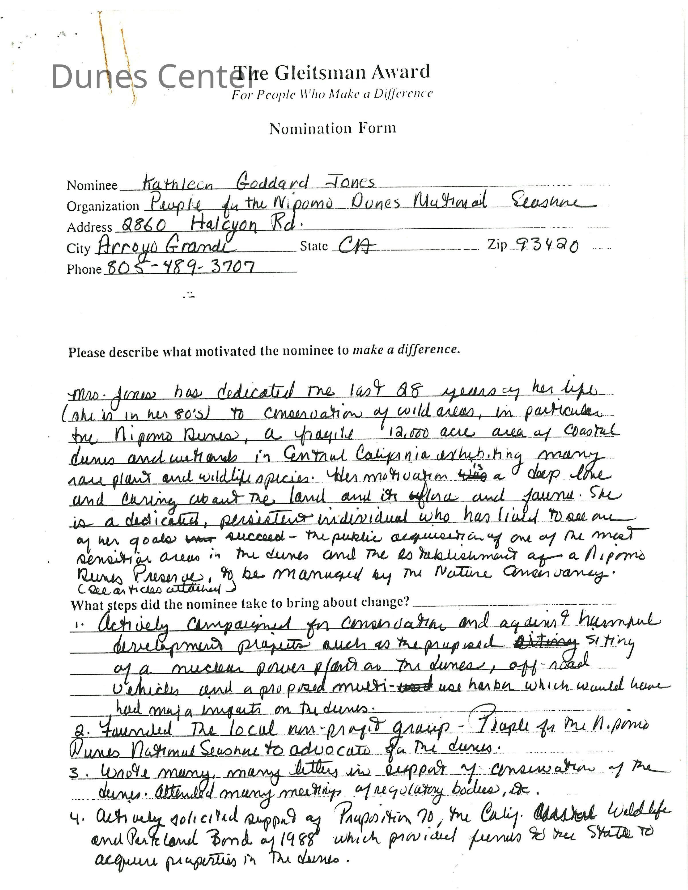 The Gleitsman Award nomination form for Kathleen Goddard Jones. Includes attached articles about the Nipomo Dunes and Kathleen Goddard-Jones.