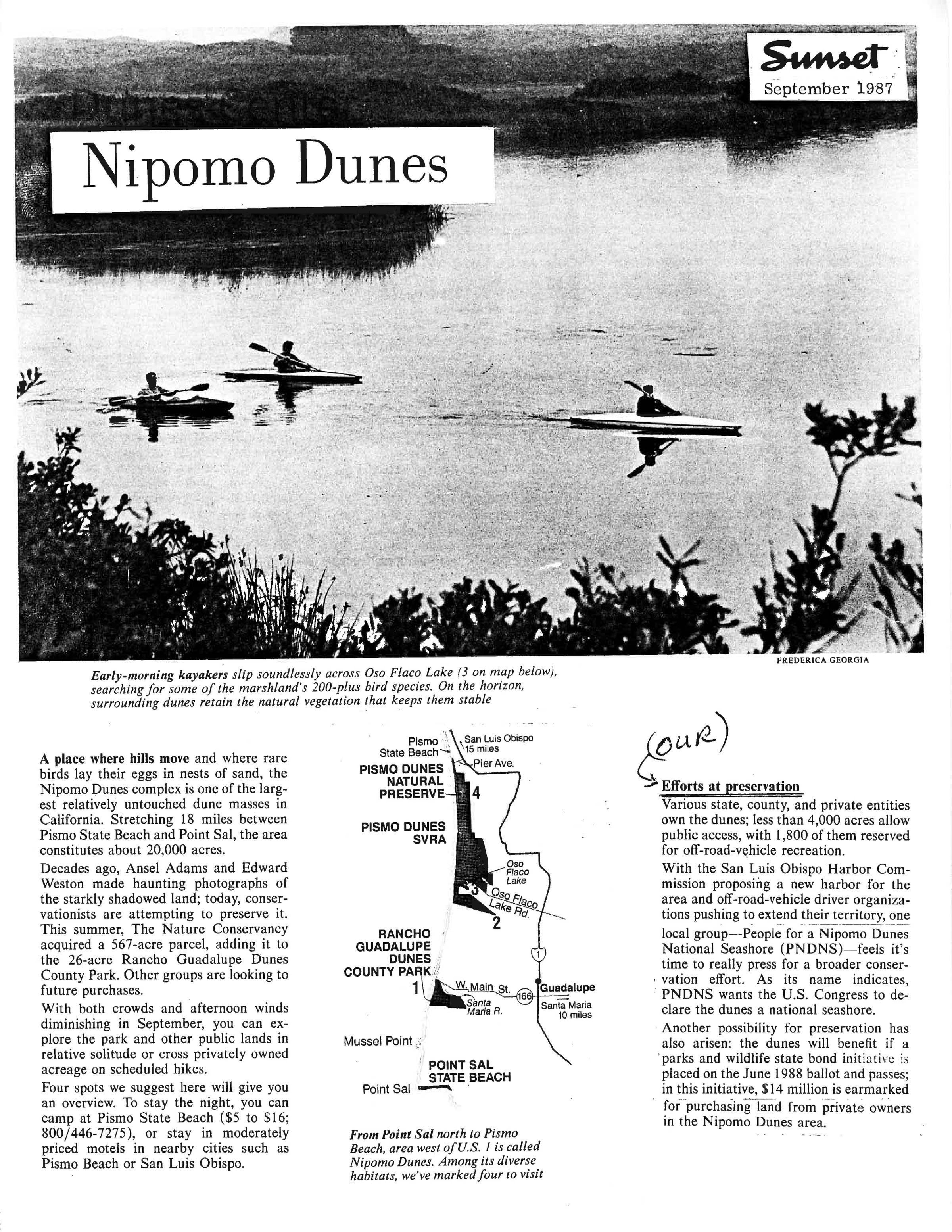 Copy of article from Sunset Magazine September 1987. Contains information on the Nipomo Dunes and discusses efforts of preservation as well as different ecological sites. Annotated by Kathleen Goddard Jones.