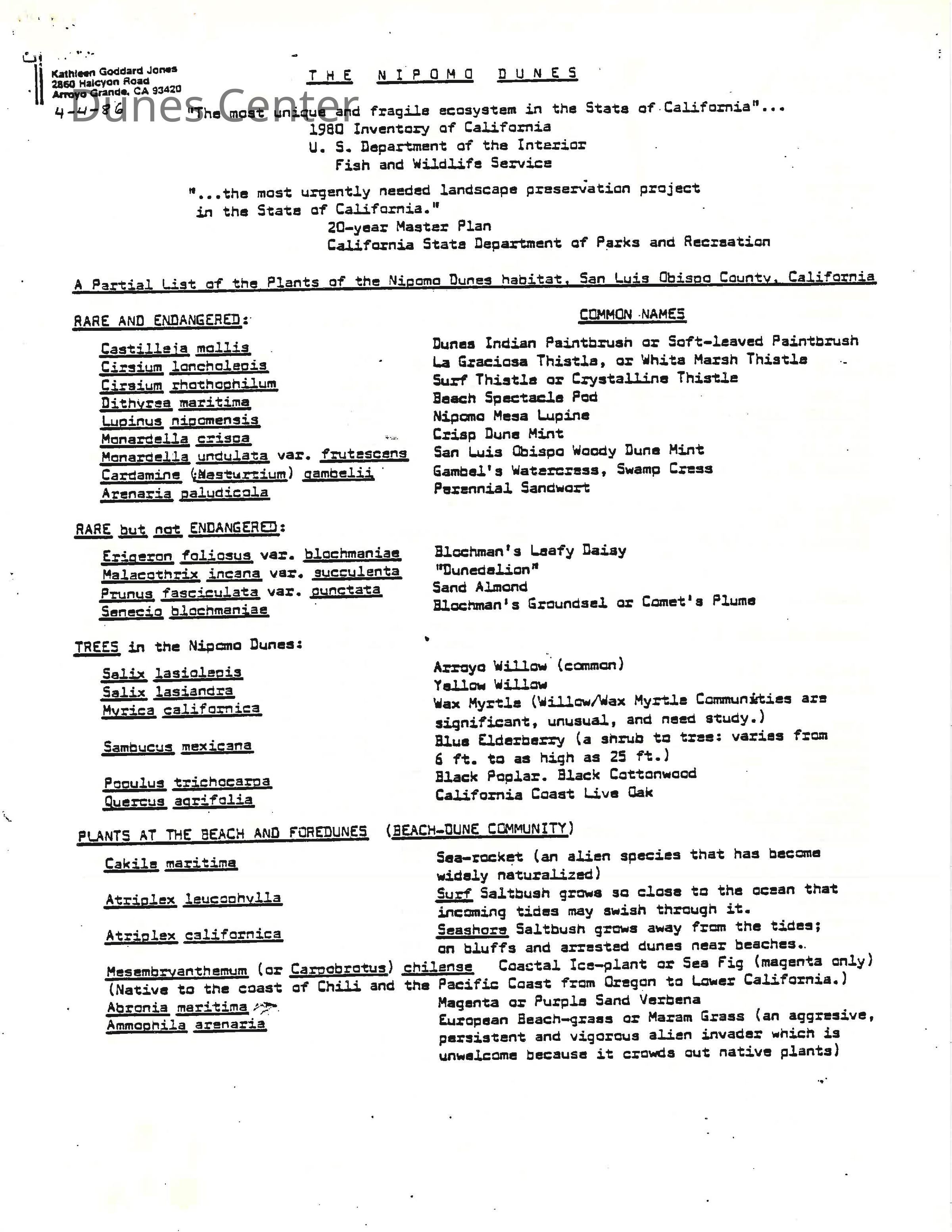 Partial List of plants and animals of the Nipomo Dunes Habitat by Kathleen Goddard Jones.