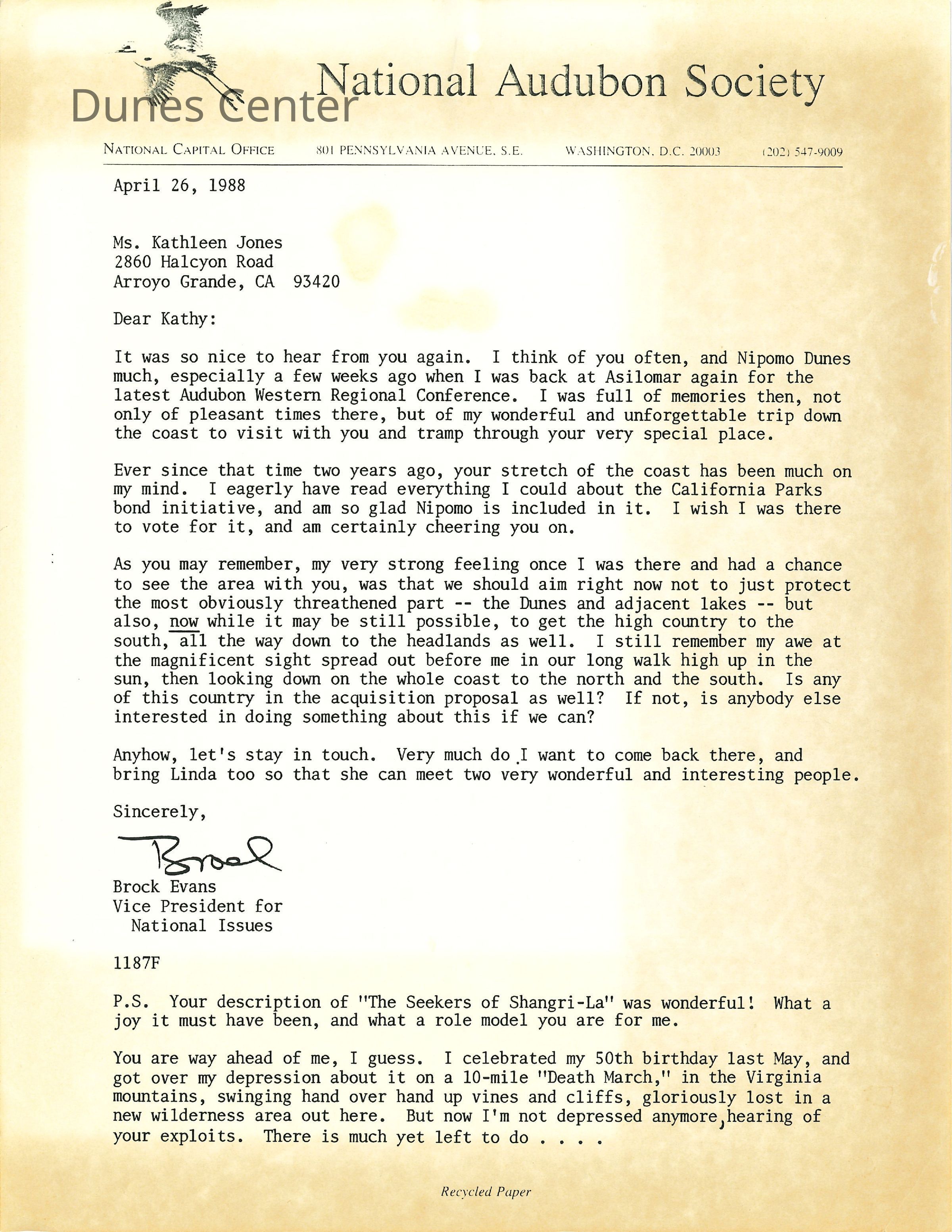 April 26, 1988. Letter from Brock Evans, the Vice President for National Issues from the National Audubon Society to Kathleen Goddard Jones. He asks if there are plans to protect not just the Dunes and adjacent lakes but also all the way down south to the headlands. Attached hand written note.