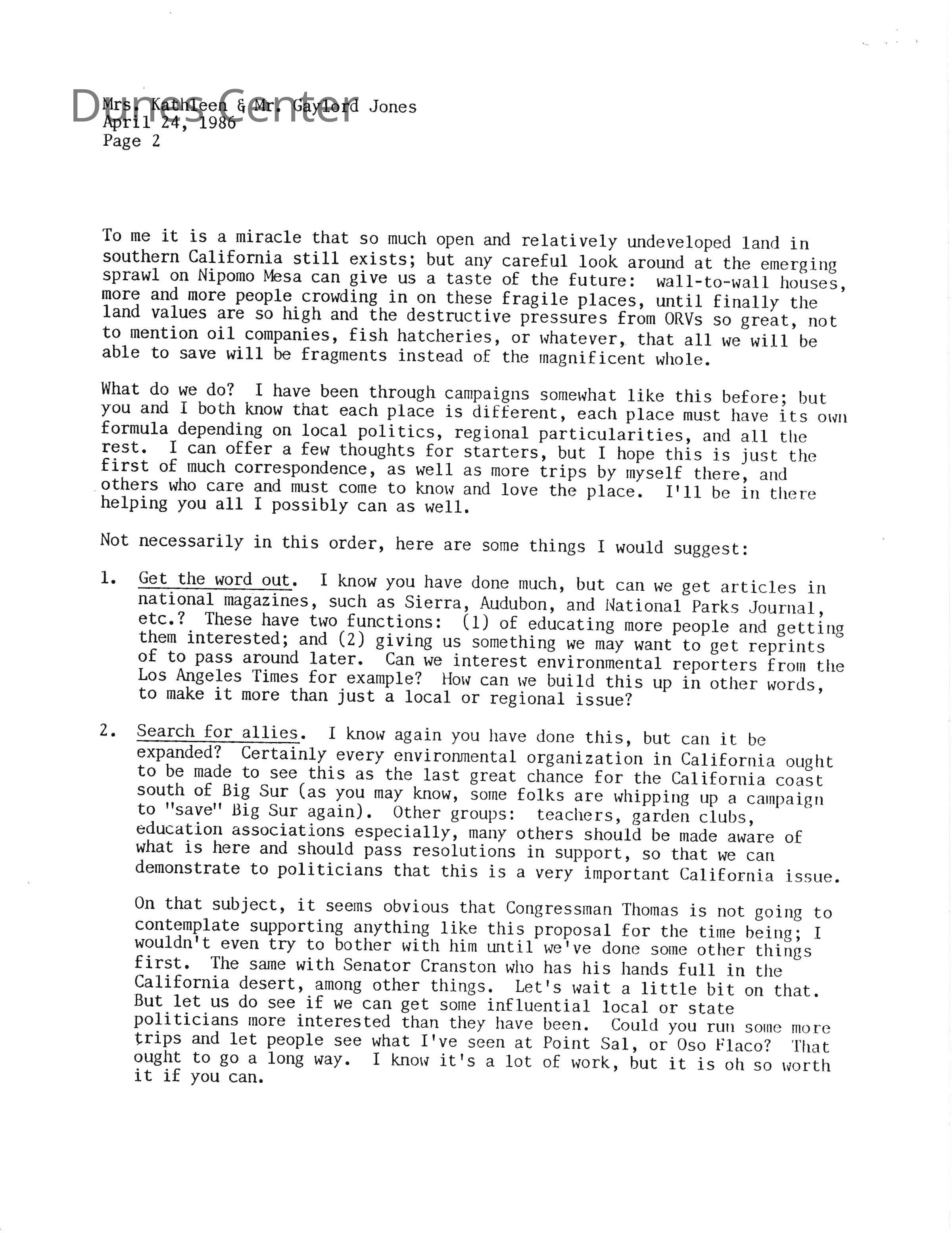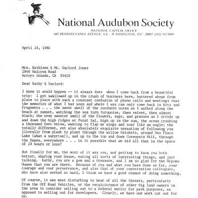 April 24,1986. Letter from Brock Evans of the National Audubon Society to Kathleen Goddard Jones.