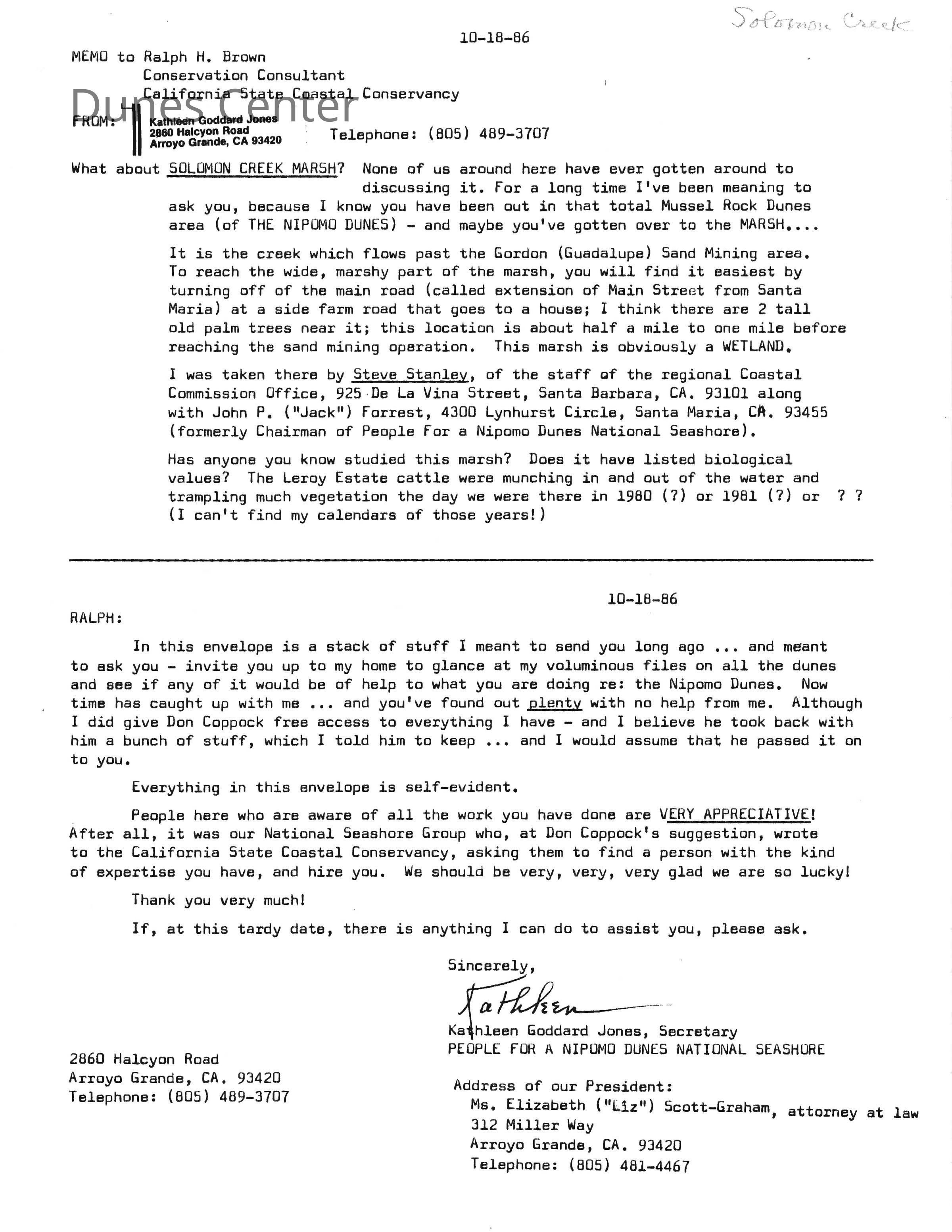 October 19,1986. Memorandum from Kathleen Goddard Jones to Ralph H. Brown the Conservation Consultant from the California State Coastal Conservancy.