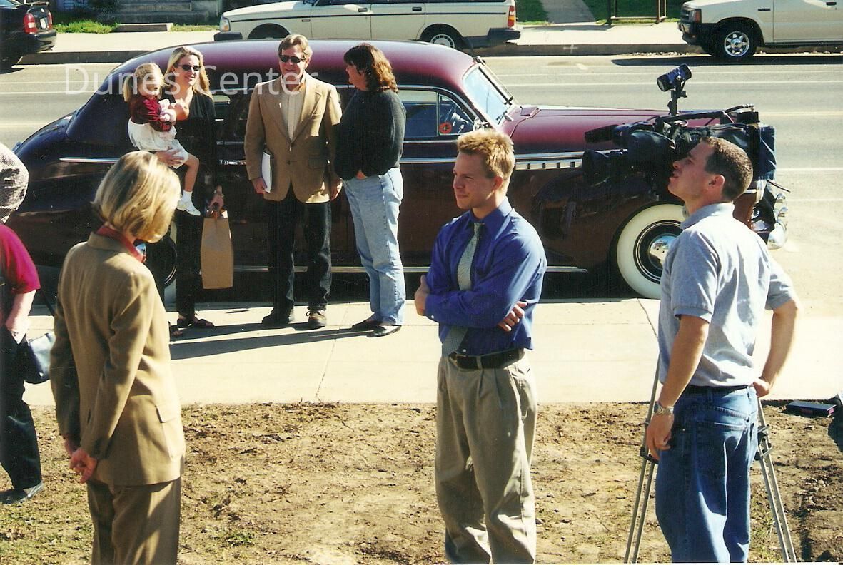 Grand Opening of Dunes Center 12/2000. KCOY reporter interviewing Rep. Lois Capps, Kara Smith & daughter Harland, Mark Skinner, Jeanie Langford