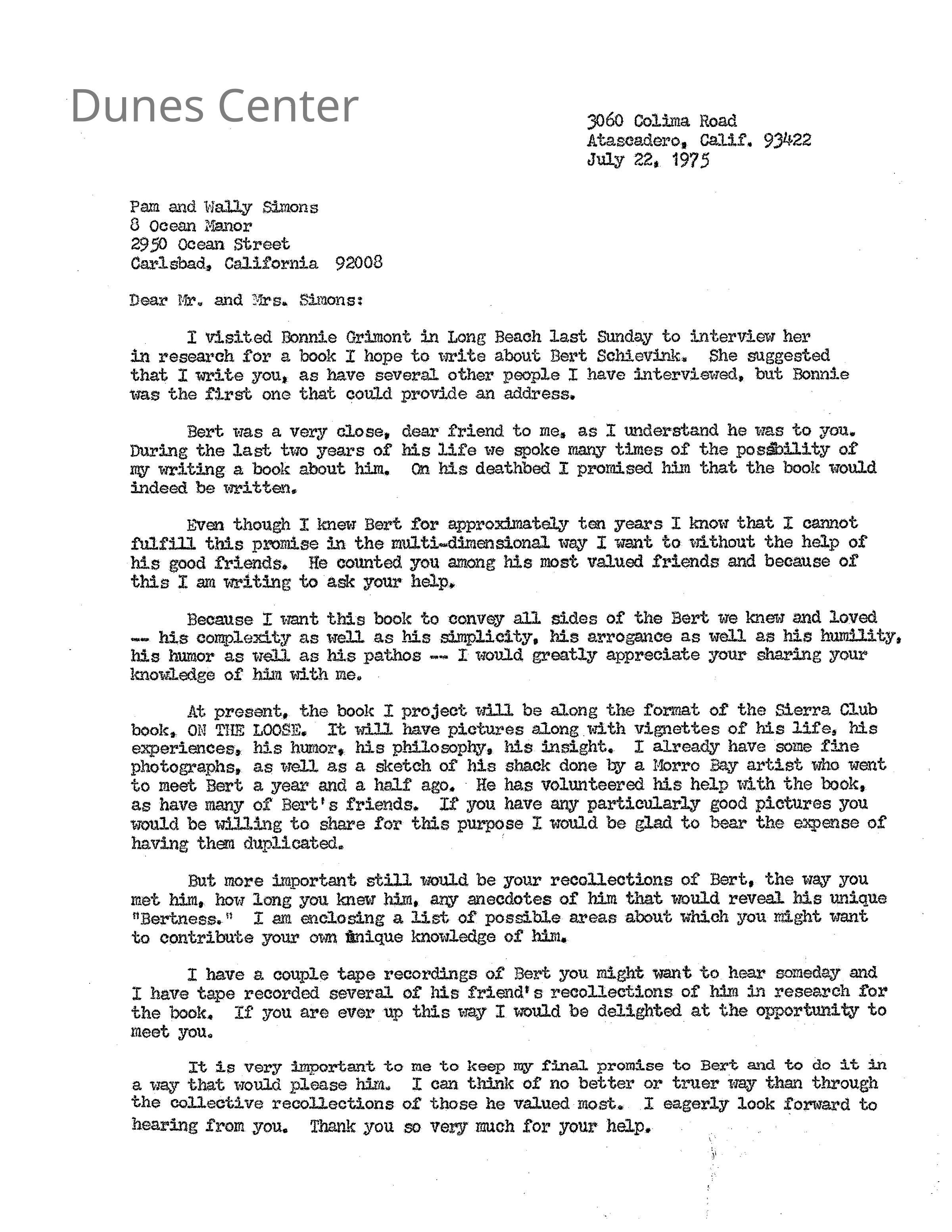 Letter to Pam and Wally Simons asking for information about Bert Schievink