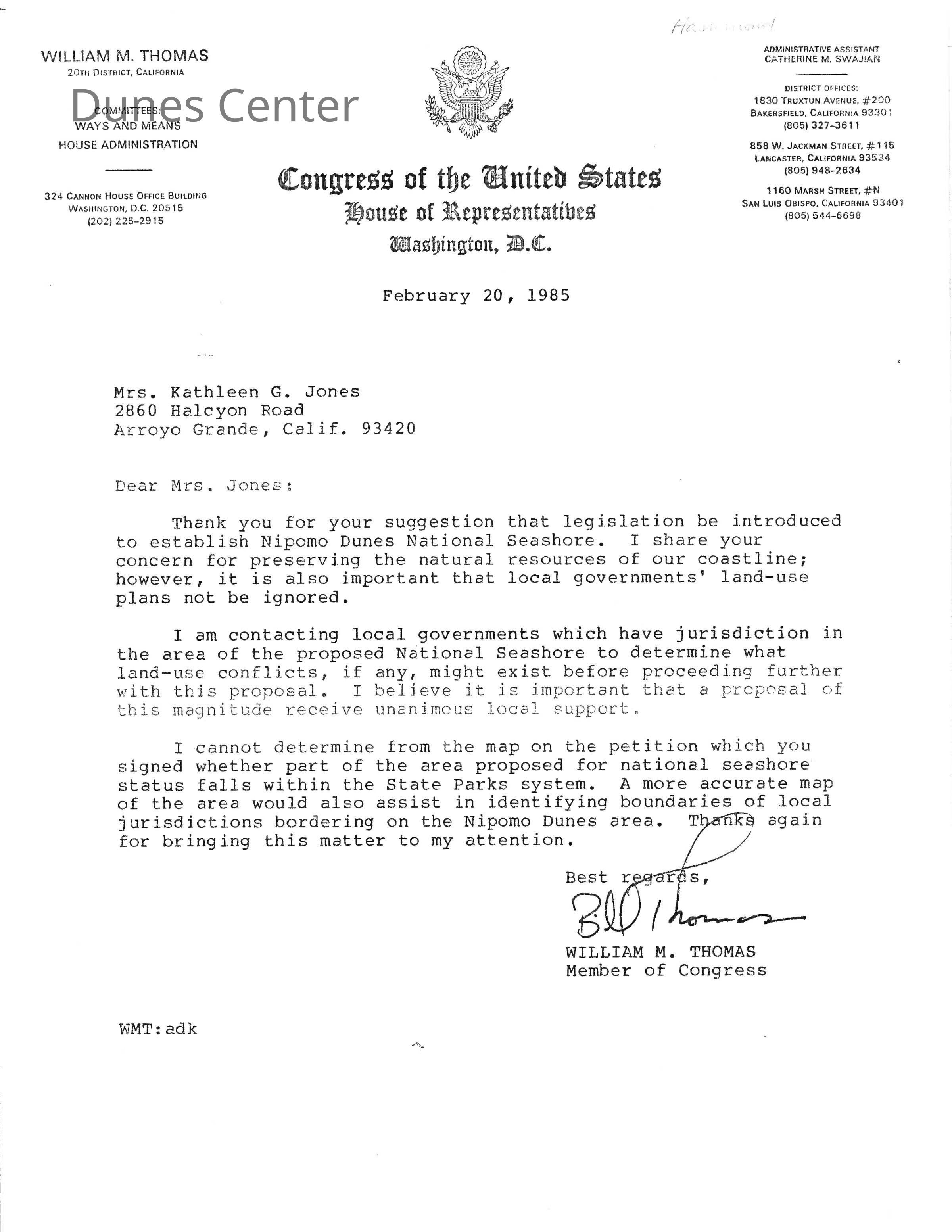 February 20, 1985. Letter from William M. Thomas, member of Congress to Kathleen Goddard Jones.