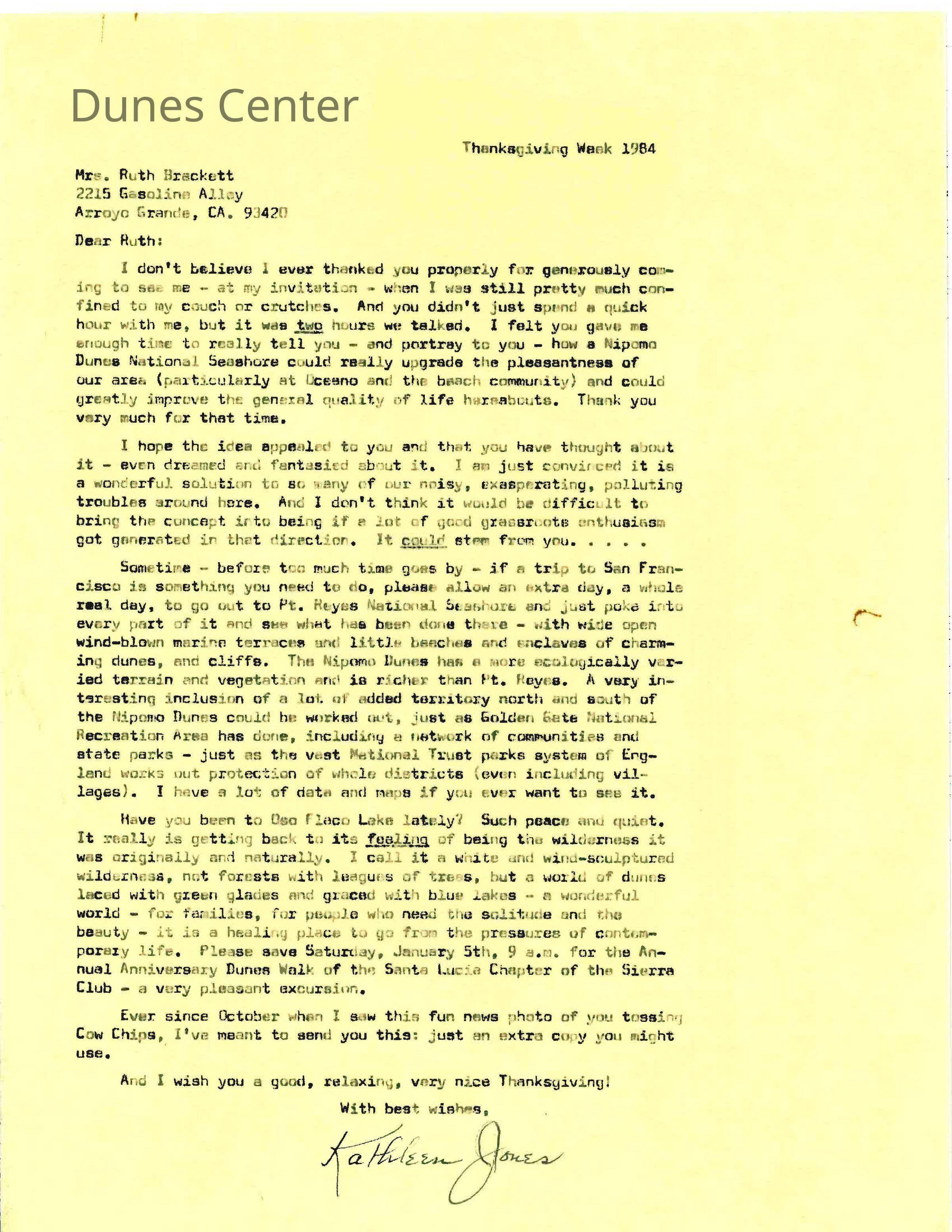 Thanksgiving Week 1984. Letter from Kathleen Goddard Jones to Ruth Brackett.