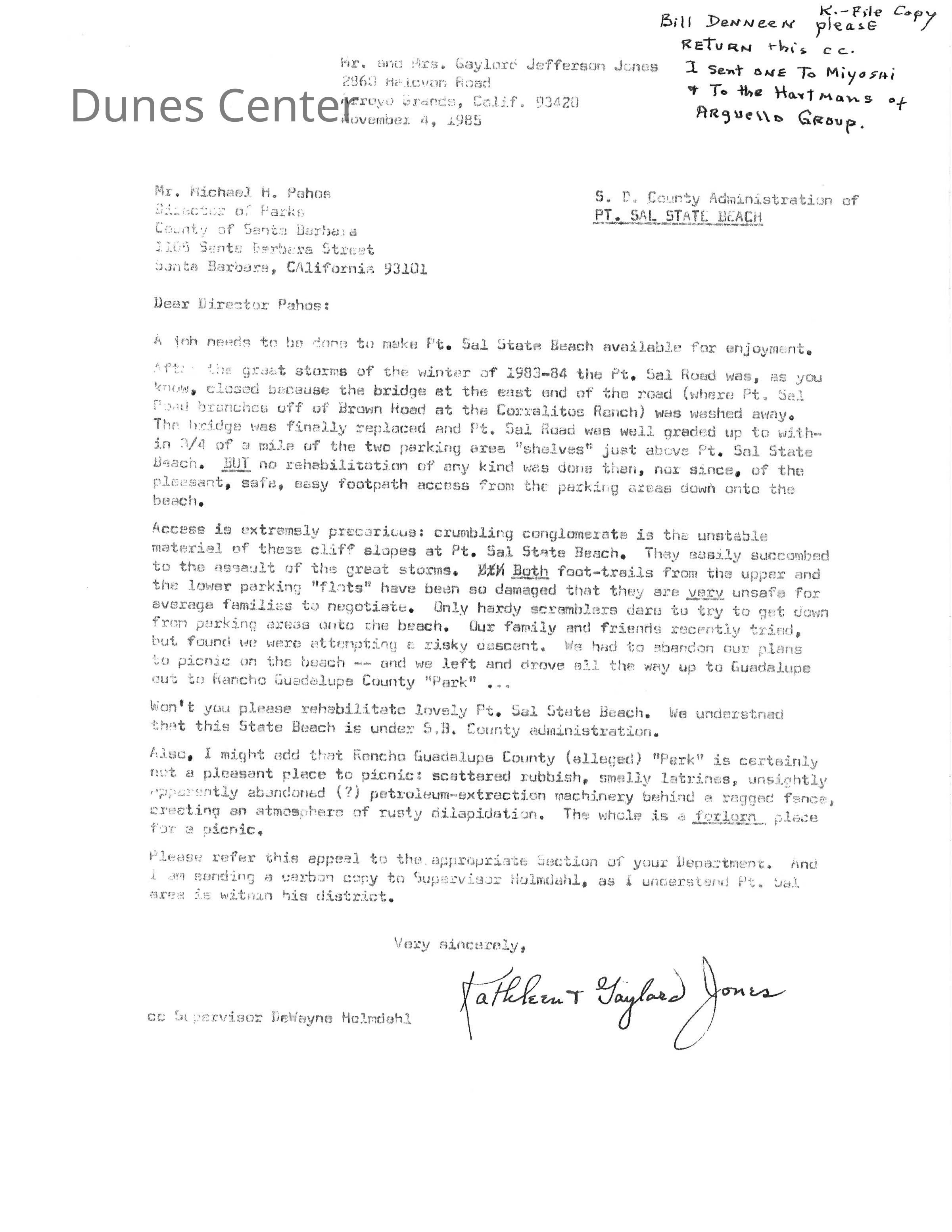 November 4, 1985. Letter from Kathleen Goddard Jones to Michael H. Pahos, Director of Parks from the County of Santa Barbara regarding Pt. Sal State Beach.