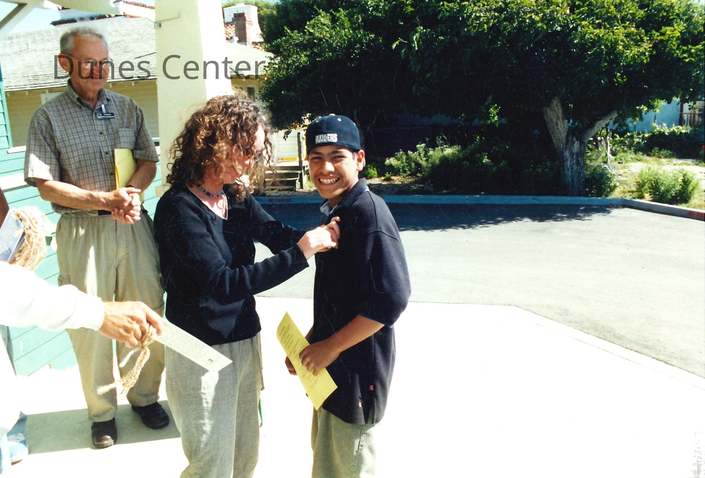 Conagh Duggan pins a Junior Docent at First Junior Docent Training June 2001; 4 x 6 color photograph