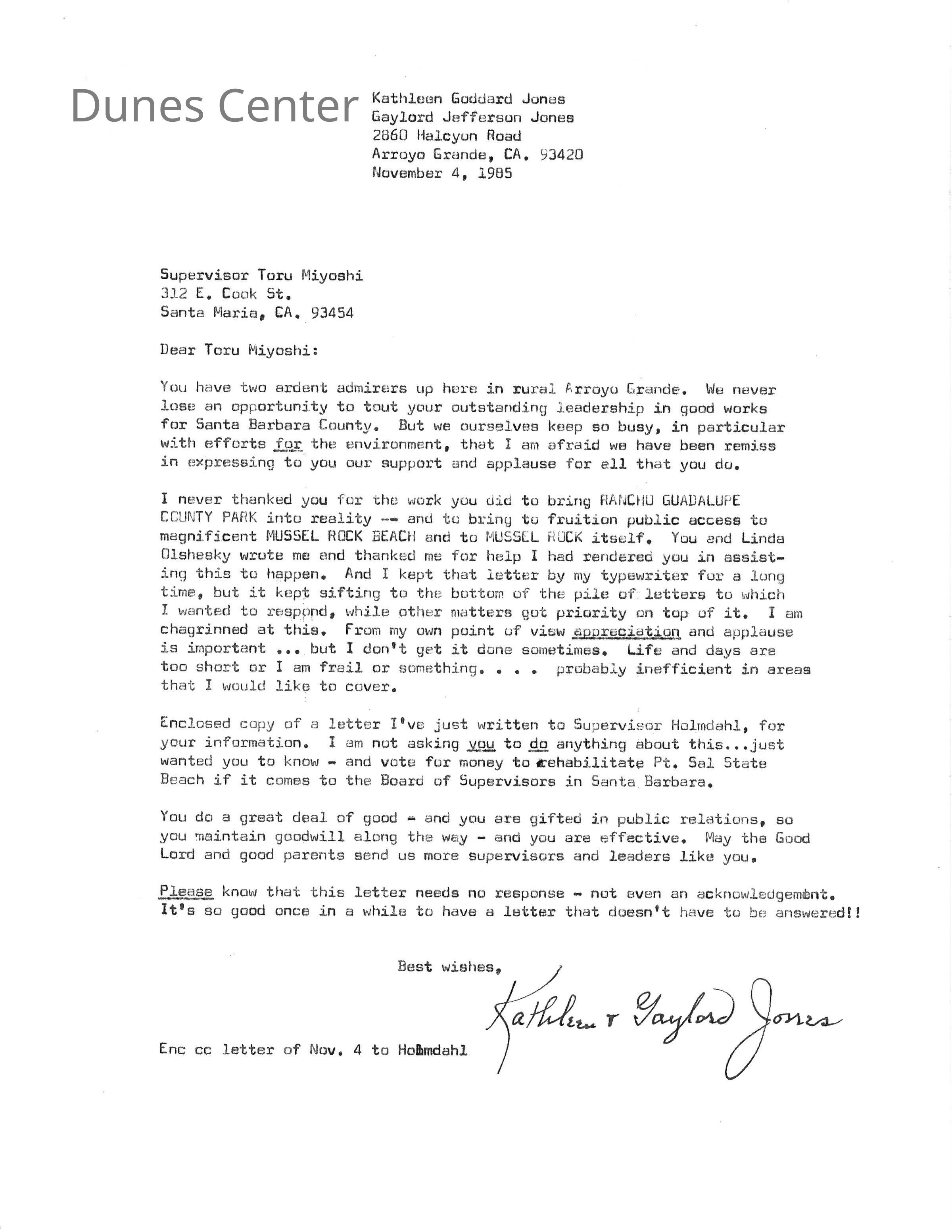 November 4, 1985. Letter from Kathleen Goddard Jones to Supervisor Toru Miyoshi.