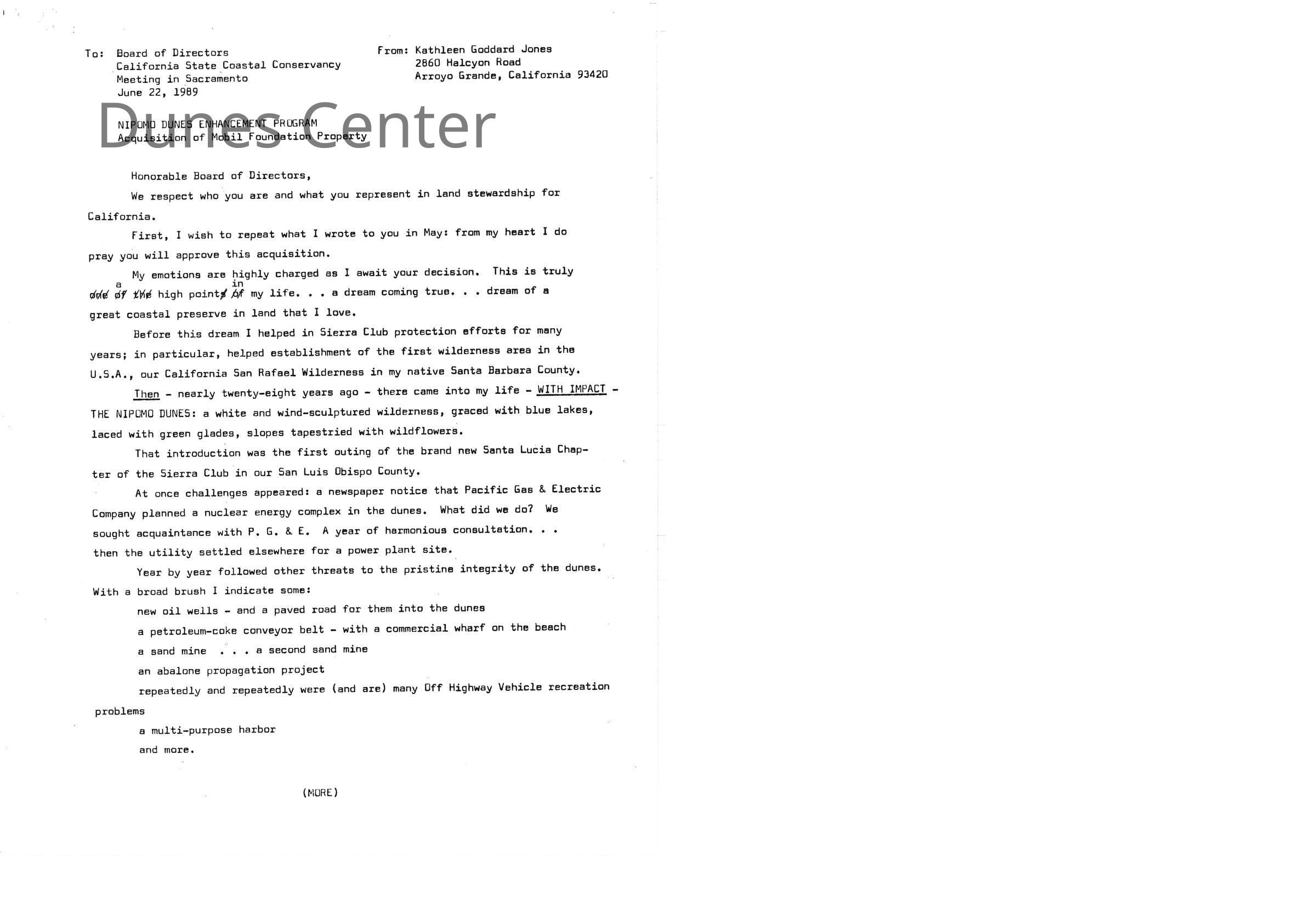 June 22, 1989. Letter from Kathleen Goddard Jones to California State Coastal Conservancy Board of Directors regarding the preservation of the Nipomo Dunes after the recent parcel acquisition of the land from the Mobil Foundation Property.