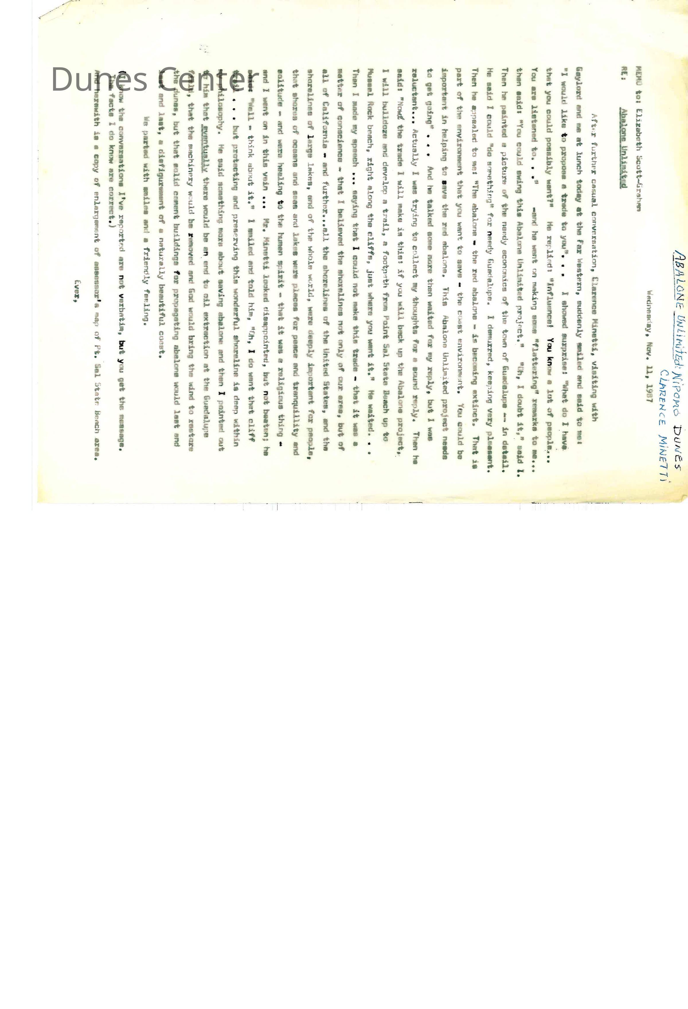 November 11, 1987. Letter from Kathleen Goddard Jones to Elizabeth Scott-Graham regarding a conversation Jones held with Clarence Minetti from the Abalone Unlimited Inc.
