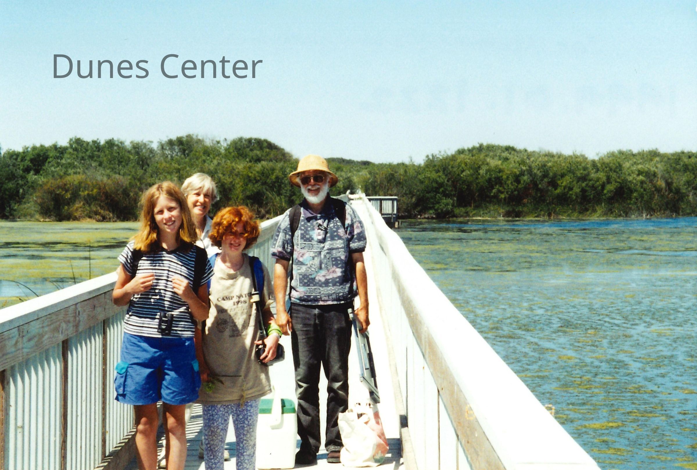 Undated color photograph of Tom Neuman, Theresa Hoffman, and two children on Oso Flaco Lake Bridge; 4" x 6" color photograph.