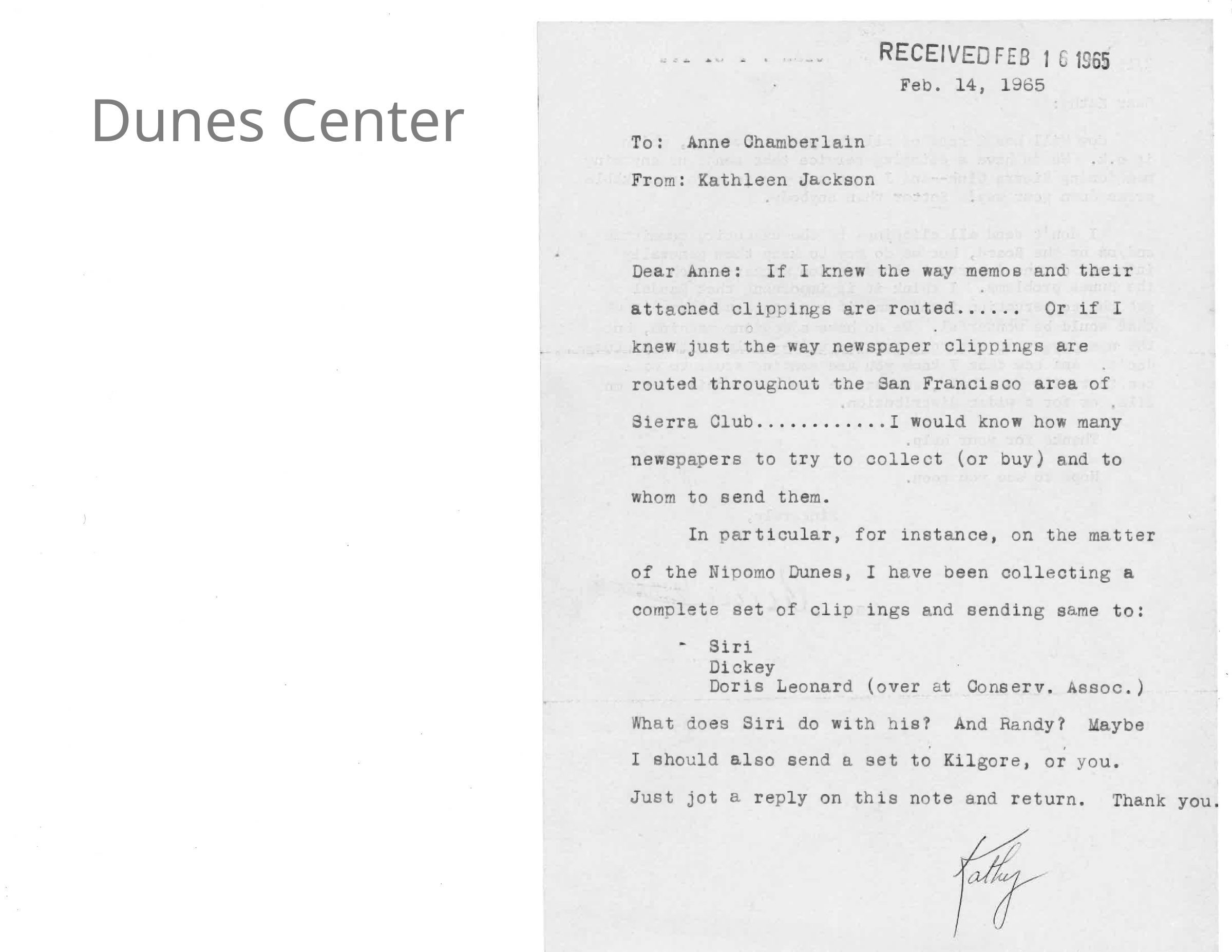 February 14, 1965. Letter from Anne Chamberlain to Kathleen Jackson regarding newspaper clippings of Sierra club and other conservationist matters.