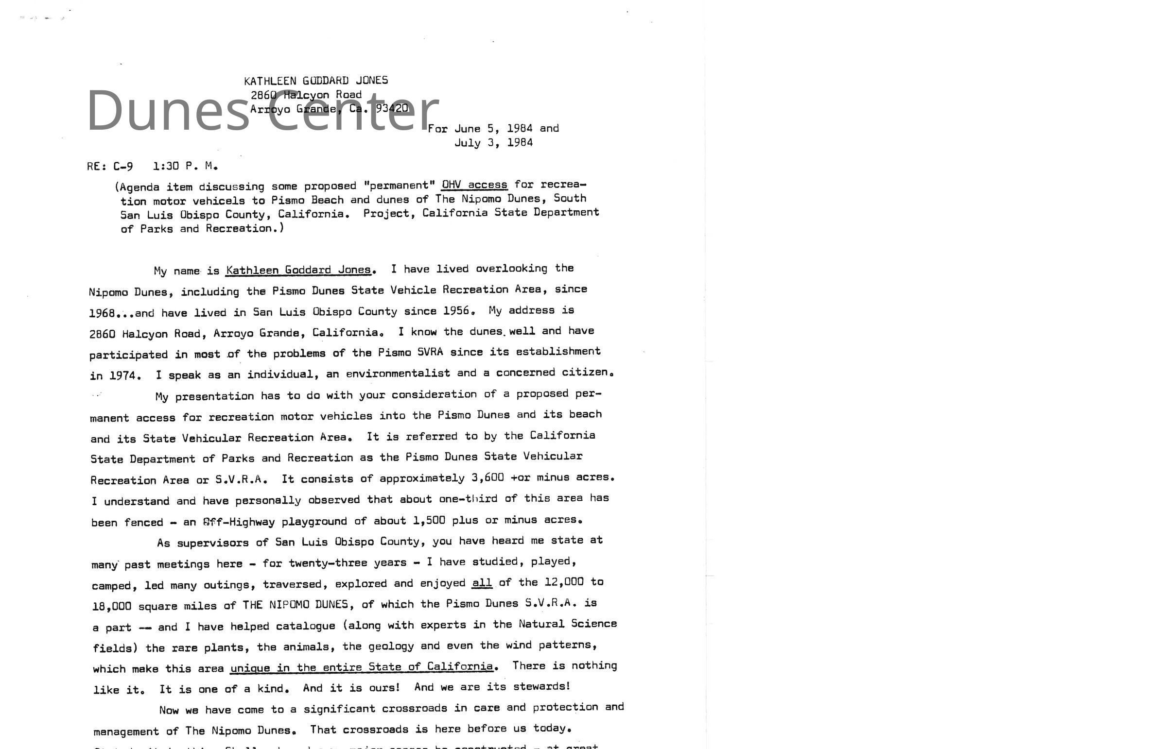 July 2, 184. Speech by Kathleen Goddard Jones at the hearing to consider Access Proposal for the Pismo State Vehicular Recreation Area. She proposes to close OHV access in Pismo due to environmental degredation and community issues.