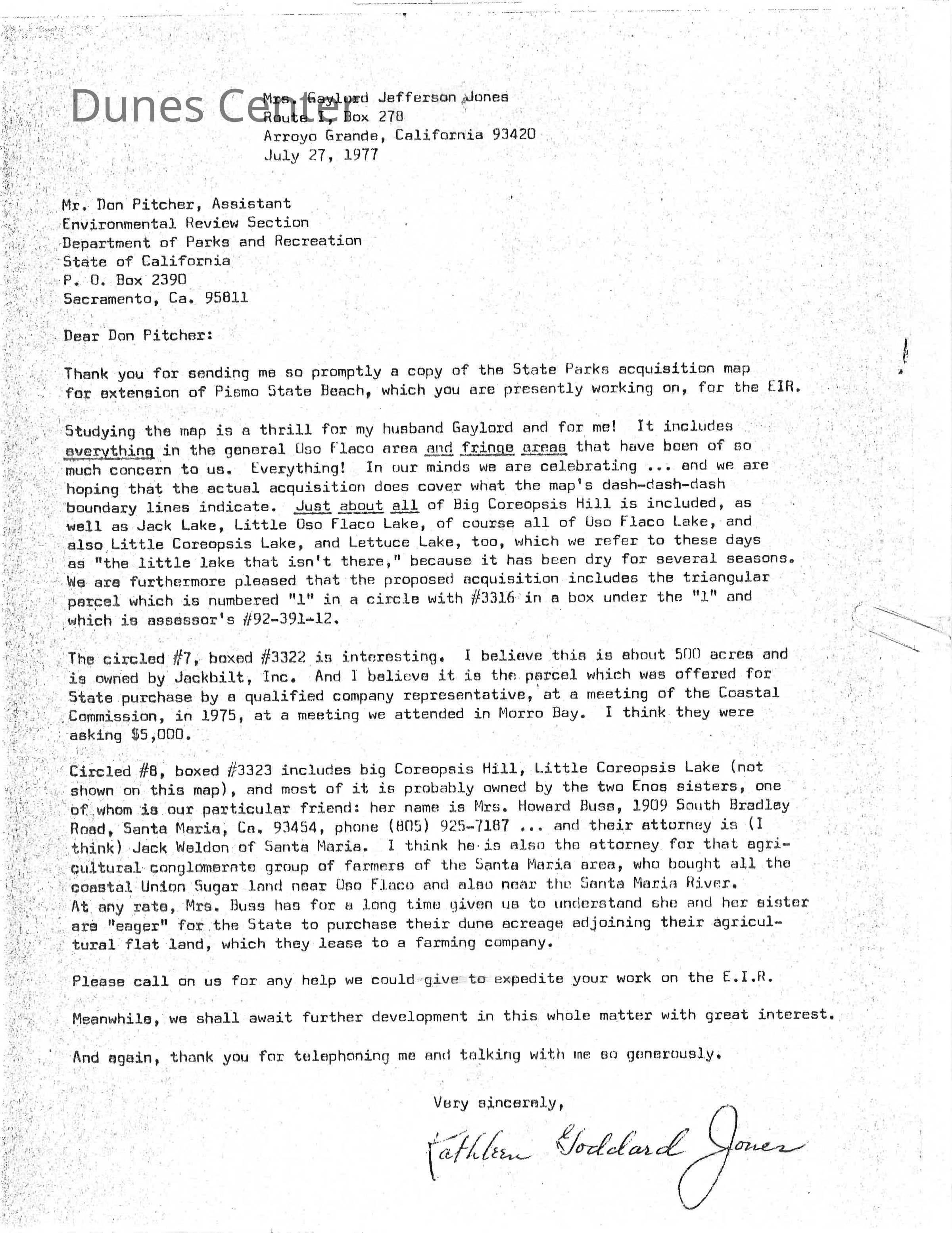 July 27, 1977. Letter from Kathleen Goddard Jones to Mr.Don Pitcher, assistant of the Environmental Review Section at the Dept. of Parks and Recreation regarding the copy of the State Parks Acquisition map for extension of Pismo State Beach that Pitcher previously sent Jones.
