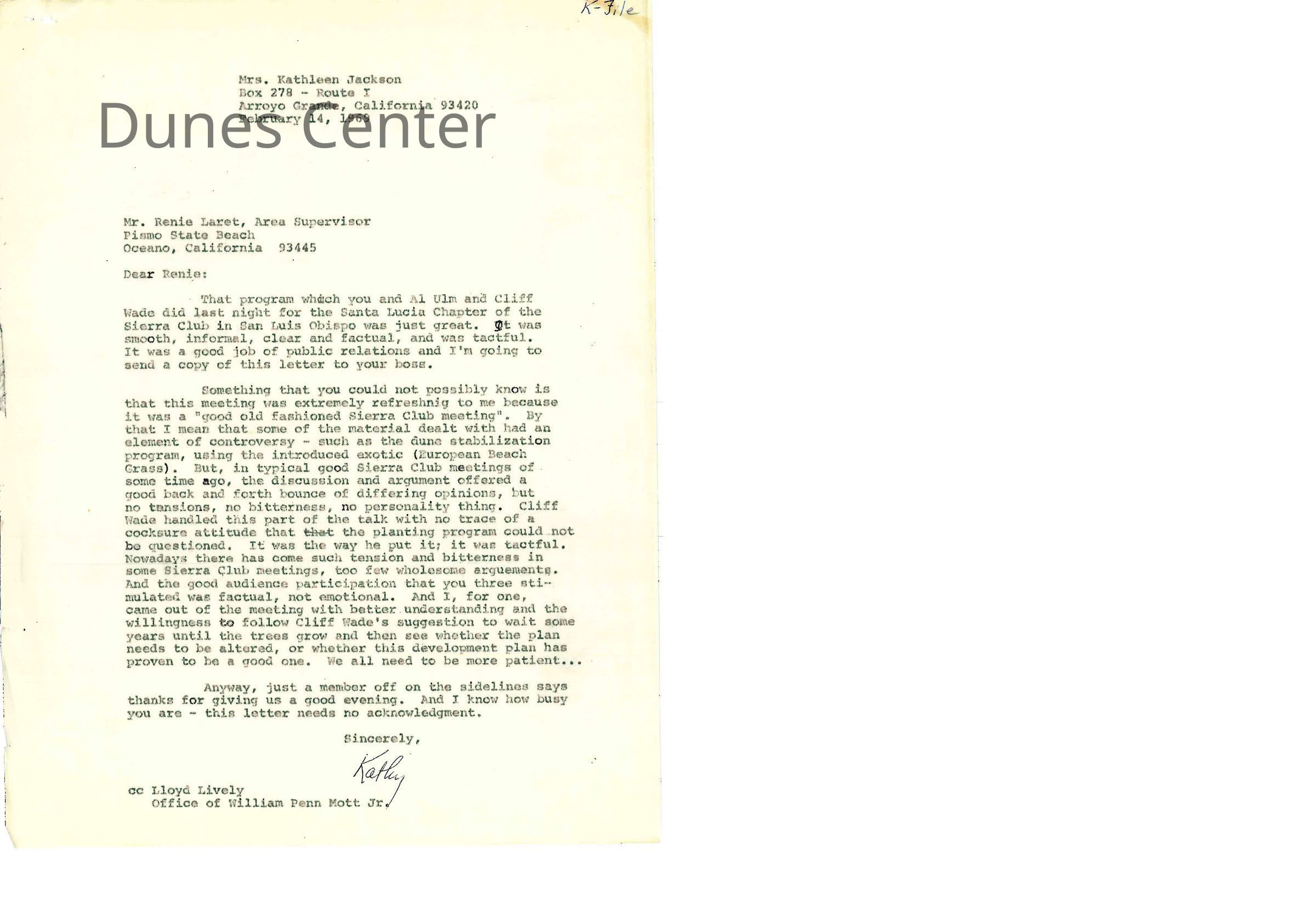 February 14, 1969. Letter from Kathleen Goddard Jones to Renie Laret, Area Supervisor at Pismo State Beach. Kathleen commends Renie on her recent program for the Santa Lucia Chapter of the Sierra Club.